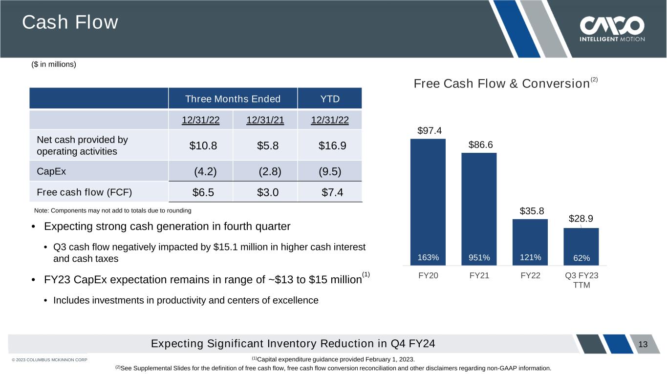 © 2023 COLUMBUS MCKINNON CORPORATION 12 Adjusted EBITDA and Margin Adjusted EBITDA & ROIC Return on Invested Capital (ROIC)(1) 6.6% 7.5% 6.9% FY21 FY22 Q3 FY23 TTM (1)ROIC is a non-GAAP measure defined as adjusted income from operations, net of taxes at a 22% normalized rate, for the trailing four quarters divided by the average of debt plus equity less cash (average capital) for the trailing five quarters. Steady Progress Towards Our Long-term Targets $77.2 $140.1 $147.3 11.9% 15.4% 15.7% FY21 FY22 Q3 FY23 TTM