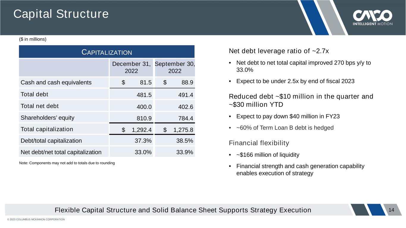 © 2023 COLUMBUS MCKINNON CORPORATION $97.4 $86.6 $35.8 $28.9 163% 951% 121% 62% FY20 FY21 FY22 Q3 FY23 TTM 13 Free Cash Flow & Conversion (2) Cash Flow Note: Components may not add to totals due to rounding Three Months Ended YTD 12/31/22 12/31/21 12/31/22 Net cash provided by operating activities $10.8 $5.8 $16.9 CapEx (4.2) (2.8) (9.5) Free cash flow (FCF) $6.5 $3.0 $7.4 (1)Capital expenditure guidance provided February 1, 2023. (2)See Supplemental Slides for the definition of free cash flow, free cash flow conversion reconciliation and other disclaimers regarding non-GAAP information. • Expecting strong cash generation in fourth quarter • Q3 cash flow negatively impacted by $15.1 million in higher cash interest and cash taxes • FY23 CapEx expectation remains in range of ~$13 to $15 million (1) • Includes investments in productivity and centers of excellence Expecting Significant Inventory Reduction in Q4 FY24 ($ in millions)