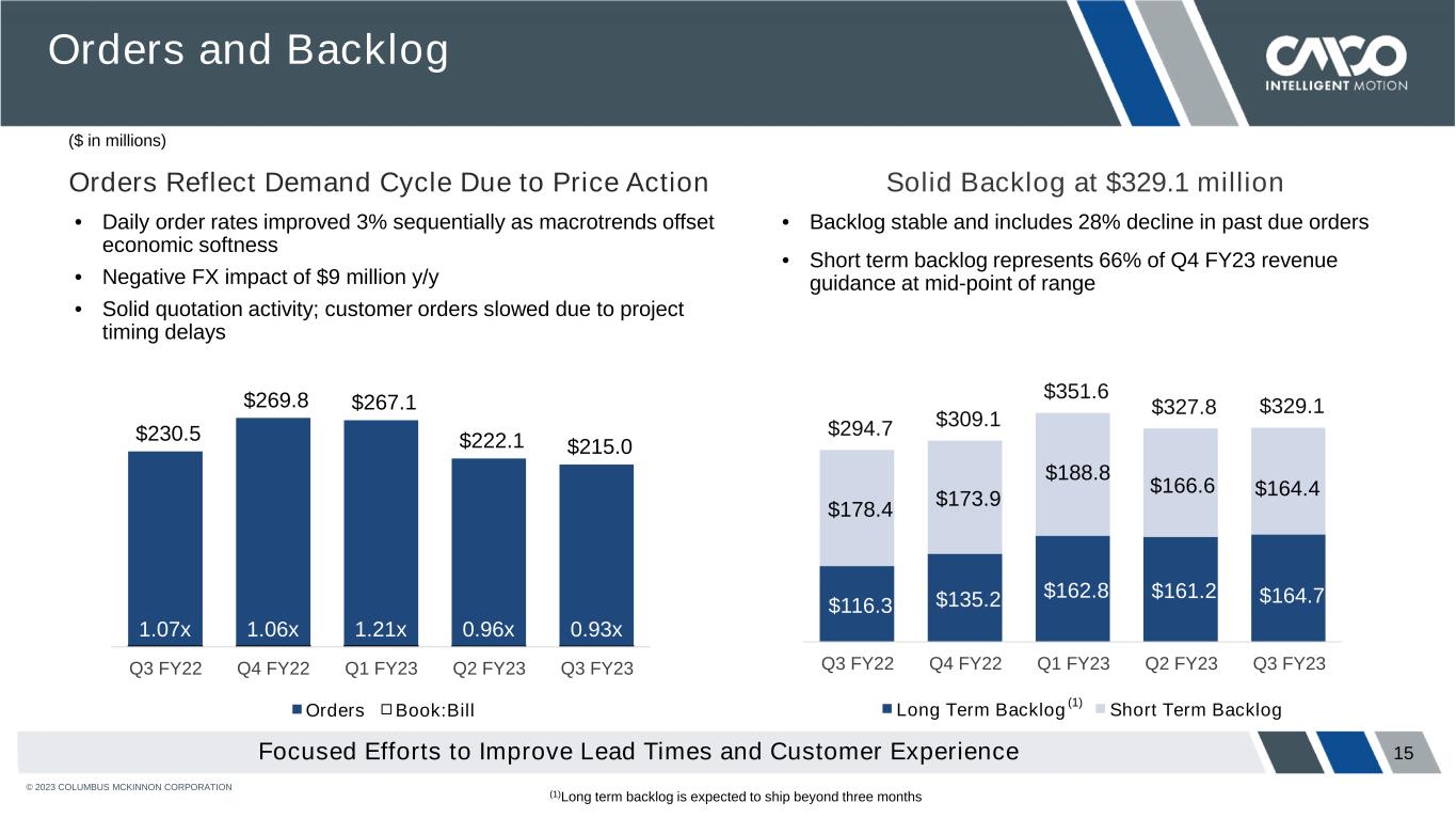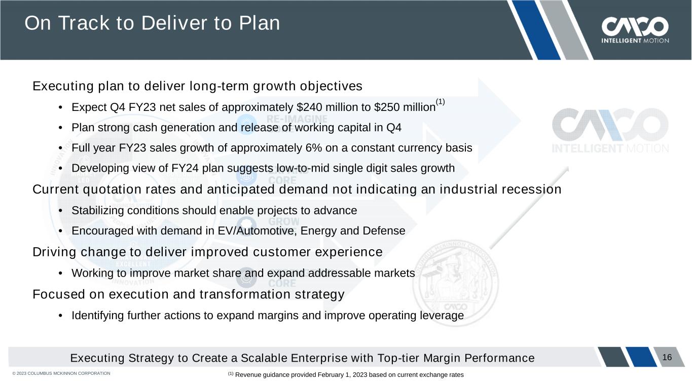 © 2023 COLUMBUS MCKINNON CORPORATION 15 Orders Reflect Demand Cycle Due to Price Action Solid Backlog at $329.1 million Orders and Backlog • Daily order rates improved 3% sequentially as macrotrends offset economic softness • Negative FX impact of $9 million y/y • Solid quotation activity; customer orders slowed due to project timing delays • Backlog stable and includes 28% decline in past due orders • Short term backlog represents 66% of Q4 FY23 revenue guidance at mid-point of range Focused Efforts to Improve Lead Times and Customer Experience $230.5 $269.8 $267.1 $222.1 $215.0 1.07x 1.06x 1.21x 0.96x 0.93x Q3 FY22 Q4 FY22 Q1 FY23 Q2 FY23 Q3 FY23 Orders Book:Bill (1)Long term backlog is expected to ship beyond three months $116.3 $135.2 $162.8 $161.2 $164.7 $178.4 $173.9 $188.8 $166.6 $164.4 $294.7 $309.1 $351.6 $327.8 $329.1 Q3 FY22 Q4 FY22 Q1 FY23 Q2 FY23 Q3 FY23 Long Term Backlog Short Term Backlog (1) ($ in millions)