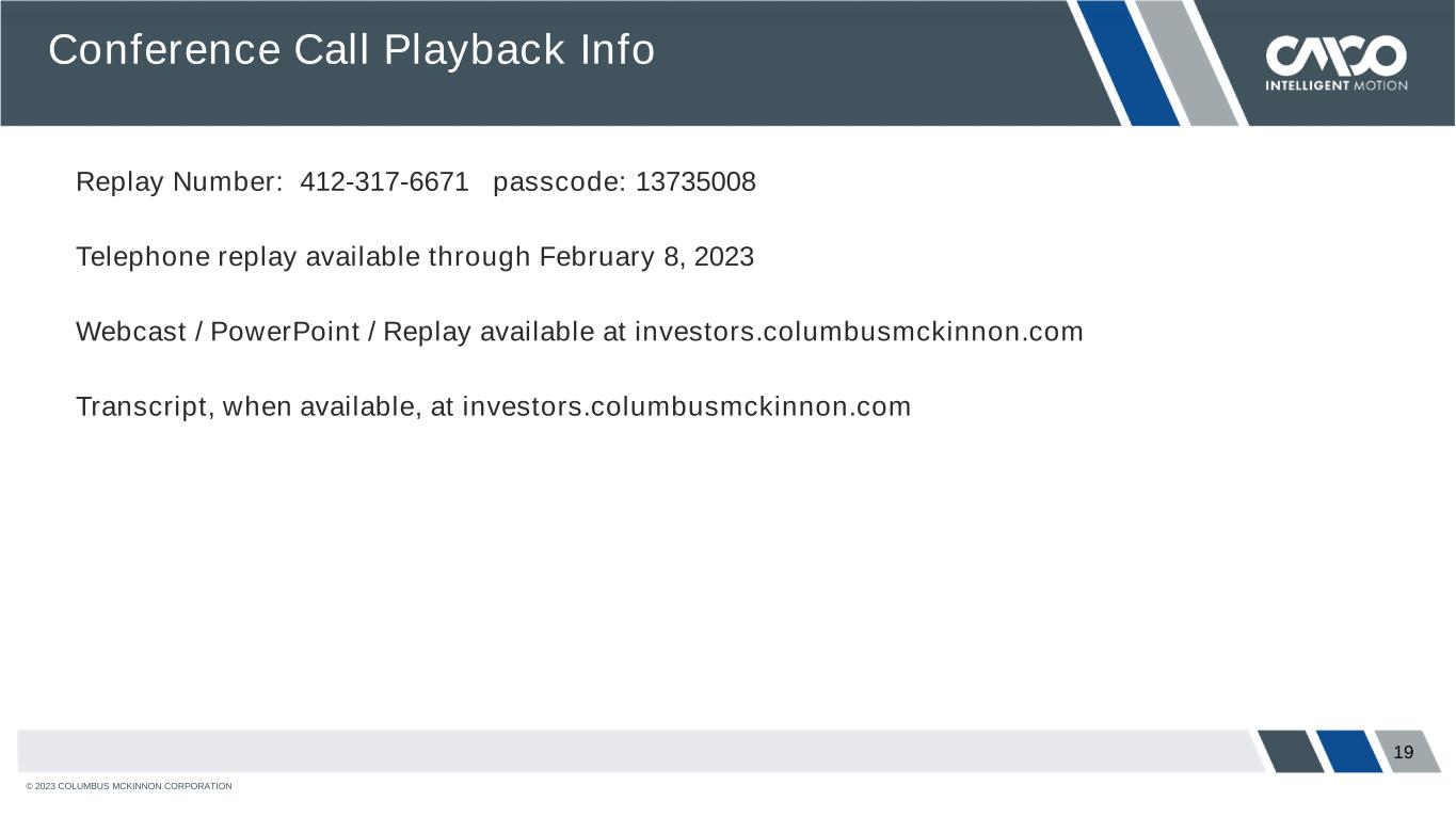 © 2023 COLUMBUS MCKINNON CORPORATION 19 Conference Call Playback Info Replay Number: 412-317-6671 passcode: 13735008 Telephone replay available through February 8, 2023 Webcast / PowerPoint / Replay available at investors.columbusmckinnon.com Transcript, when available, at investors.columbusmckinnon.com
