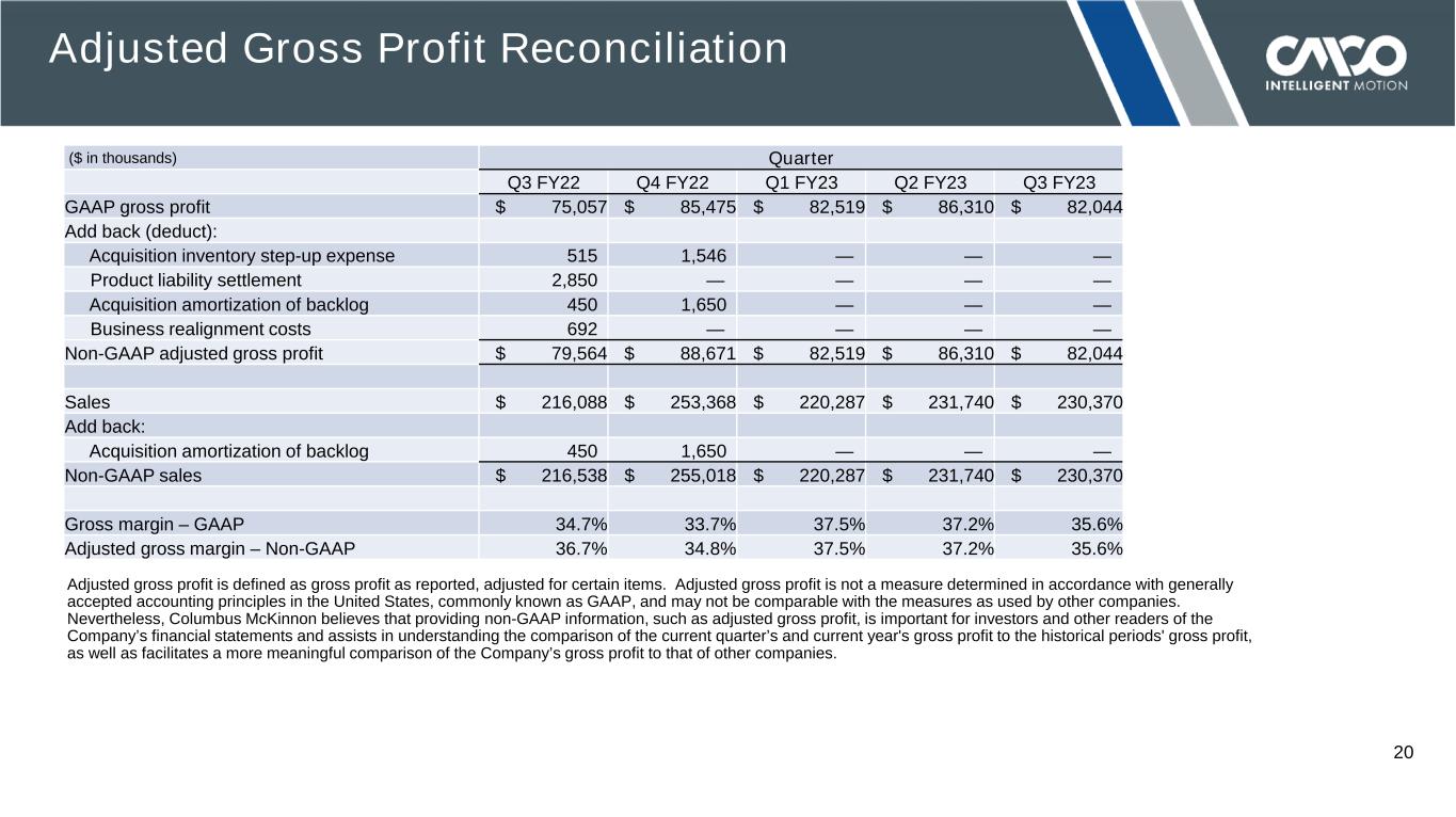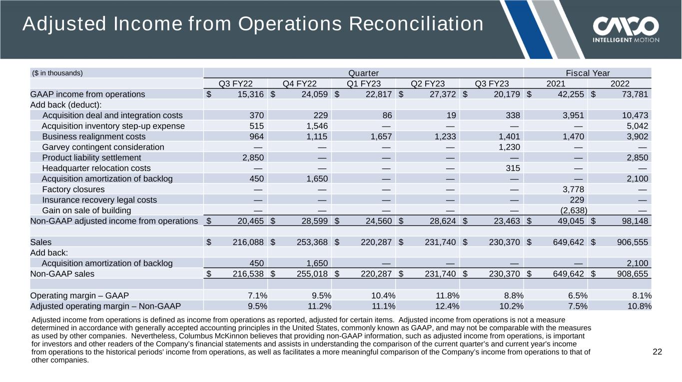 © 2023 COLUMBUS MCKINNON CORPORATION 21 Adjusted Gross Profit Reconciliation Adjusted gross profit is defined as gross profit as reported, adjusted for certain items. Adjusted gross profit is not a measure determined in accordance with generally accepted accounting principles in the United States, commonly known as GAAP, and may not be comparable with the measures as used by other companies. Nevertheless, Columbus McKinnon believes that providing non-GAAP information, such as adjusted gross profit, is important for investors and other readers of the Company’s financial statements and assists in understanding the comparison of the current quarter’s and current year's gross profit to the historical periods' gross profit, as well as facilitates a more meaningful comparison of the Company’s gross profit to that of other companies. ($ in thousands) Fiscal Year TTM 2018 2019 2020 2021 2022 Q3 FY23 GAAP gross profit $ 285,061 $ 304,997 $ 283,186 $ 220,225 $ 315,730 $ 336,348 Add back (deduct): Product liability settlement — — — — 2,850 — Acquisition amortization of backlog — — — — 2,100 1,650 Acquisition inventory step-up expense — — — — 5,042 1,546 Business realignment costs — 286 1,037 830 1,606 — Acquisition deal and integration costs 307 — — — 521 — Factory closures — 1,473 2,800 2,671 — — Insurance settlement (2,362) — (382) — — — Gain on sale of building — — — (2,189) — — Non-GAAP adjusted gross profit $ 283,006 $ 306,756 $ 286,641 $ 221,537 $ 327,849 $ 339,544 Sales $ 839,419 $ 876,282 $ 809,162 $ 649,642 $ 906,555 $ 935,765 Add back: Acquisition amortization of backlog — — — — 2,100 1,650 Non-GAAP sales $ 839,419 $ 876,282 $ 809,162 $ 649,642 $ 908,655 $ 937,415 Gross margin – GAAP 34.0% 34.8% 35.0% 33.9% 34.8% 35.9% Adjusted gross margin – Non-GAAP 33.7% 35.0% 35.4% 34.1% 36.1% 36.2%