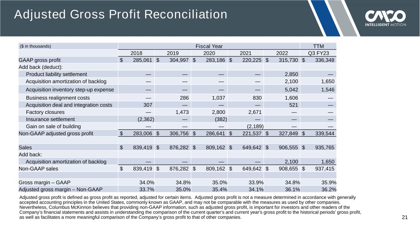 © 2023 COLUMBUS MCKINNON CORPORATION 20 Adjusted Gross Profit Reconciliation Adjusted gross profit is defined as gross profit as reported, adjusted for certain items. Adjusted gross profit is not a measure determined in accordance with generally accepted accounting principles in the United States, commonly known as GAAP, and may not be comparable with the measures as used by other companies. Nevertheless, Columbus McKinnon believes that providing non-GAAP information, such as adjusted gross profit, is important for investors and other readers of the Company’s financial statements and assists in understanding the comparison of the current quarter’s and current year's gross profit to the historical periods' gross profit, as well as facilitates a more meaningful comparison of the Company’s gross profit to that of other companies. ($ in thousands) Quarter Q3 FY22 Q4 FY22 Q1 FY23 Q2 FY23 Q3 FY23 GAAP gross profit $ 75,057 $ 85,475 $ 82,519 $ 86,310 $ 82,044 Add back (deduct): Acquisition inventory step-up expense 515 1,546 — — — Product liability settlement 2,850 — — — — Acquisition amortization of backlog 450 1,650 — — — Business realignment costs 692 — — — — Non-GAAP adjusted gross profit $ 79,564 $ 88,671 $ 82,519 $ 86,310 $ 82,044 Sales $ 216,088 $ 253,368 $ 220,287 $ 231,740 $ 230,370 Add back: Acquisition amortization of backlog 450 1,650 — — — Non-GAAP sales $ 216,538 $ 255,018 $ 220,287 $ 231,740 $ 230,370 Gross margin – GAAP 34.7% 33.7% 37.5% 37.2% 35.6% Adjusted gross margin – Non-GAAP 36.7% 34.8% 37.5% 37.2% 35.6%
