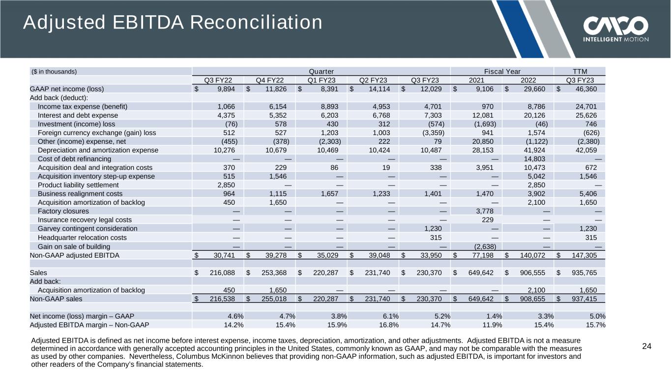 © 2023 COLUMBUS MCKINNON CORPORATION 23 Adjusted Net Income Reconciliation (1)Applies normalized tax rate of 22% to GAAP pre-tax income and non-GAAP adjustments above, which are each pre-tax. Adjusted net income and diluted EPS are defined as GAAP net income/(loss) and diluted EPS as reported, adjusted for certain items, including amortization of intangible assets, and also adjusted for a normalized tax rate. Adjusted net income and diluted EPS are not measures determined in accordance with generally accepted accounting principles in the United States, commonly known as GAAP, and may not be comparable with the measures used by other companies. Nevertheless, Columbus McKinnon believes that providing non-GAAP information, such as adjusted net income and diluted EPS, is important for investors and other readers of the Company’s financial statements and assists in understanding the comparison of the current quarter’s and current year's net income/(loss) and diluted EPS to the historical periods' net income/(loss) and diluted EPS, as well as facilitates a more meaningful comparison of the Company’s net income/(loss) and diluted EPS to that of other companies. The Company believes that representing adjusted EPS provides a better understanding of its earnings power inclusive of adjusting for the non-cash amortization of intangible assets, reflecting the Company’s strategy to grow through acquisitions as well as organically. ($ in thousands, except per share data) Quarter Fiscal Year Q3 FY22 Q4 FY22 Q1 FY23 Q2 FY23 Q3 FY23 FY 2021 FY 2022 GAAP net income (loss) $ 9,894 $ 11,826 $ 8,391 $ 14,114 $ 12,029 $ 9,106 $ 29,660 Add back (deduct): Amortization of intangibles 6,254 6,635 6,535 6,447 6,459 12,623 25,283 Cost of debt refinancing — — — — — — 14,803 Acquisition deal and integration costs 370 229 86 19 338 3,951 10,473 Acquisition inventory step-up expense 515 1,546 — — — — 5,042 Business realignment costs 964 1,115 1,657 1,233 1,401 1,470 3,902 Product liability settlement 2,850 — — — — — 2,850 Garvey contingent consideration — — — — 1,230 — — Headquarter relocation costs — — — — 315 — — Acquisition amortization of backlog 450 1,650 — — — — 2,100 Non-cash pension settlement expense — — — — — 19,046 — Factory closures — — — — — 3,778 — Insurance recovery legal costs — — — — — 229 — Gain on sale of building — — — — — (2,638) — Normalize tax rate to 22%(1) (3,854) (260) 3,269 (938) (1,123) (9,708) (13,852) Non-GAAP adjusted net income $ 17,443 $ 22,741 $ 19,938 $ 20,875 $ 20,649 $ 37,857 $ 80,261 Average diluted shares outstanding 28,840 28,845 28,699 28,748 28,778 24,173 28,401 Diluted income (loss) per share – GAAP $ 0.34 $ 0.41 $ 0.29 $ 0.49 $ 0.42 $ 0.38 $ 1.04 Diluted income per share – Non-GAAP $ 0.60 $ 0.79 $ 0.69 $ 0.73 $ 0.72 $ 1.57 $ 2.83