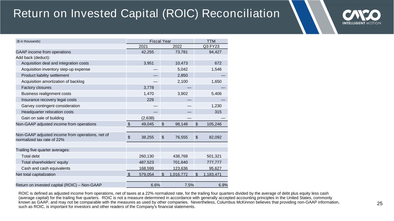 © 2023 COLUMBUS MCKINNON CORPORATION 24 Adjusted EBITDA Reconciliation Adjusted EBITDA is defined as net income before interest expense, income taxes, depreciation, amortization, and other adjustments. Adjusted EBITDA is not a measure determined in accordance with generally accepted accounting principles in the United States, commonly known as GAAP, and may not be comparable with the measures as used by other companies. Nevertheless, Columbus McKinnon believes that providing non-GAAP information, such as adjusted EBITDA, is important for investors and other readers of the Company’s financial statements. ($ in thousands) Quarter Fiscal Year TTM Q3 FY22 Q4 FY22 Q1 FY23 Q2 FY23 Q3 FY23 2021 2022 Q3 FY23 GAAP net income (loss) $ 9,894 $ 11,826 $ 8,391 $ 14,114 $ 12,029 $ 9,106 $ 29,660 $ 46,360 Add back (deduct): Income tax expense (benefit) 1,066 6,154 8,893 4,953 4,701 970 8,786 24,701 Interest and debt expense 4,375 5,352 6,203 6,768 7,303 12,081 20,126 25,626 Investment (income) loss (76) 578 430 312 (574) (1,693) (46) 746 Foreign currency exchange (gain) loss 512 527 1,203 1,003 (3,359) 941 1,574 (626) Other (income) expense, net (455) (378) (2,303) 222 79 20,850 (1,122) (2,380) Depreciation and amortization expense 10,276 10,679 10,469 10,424 10,487 28,153 41,924 42,059 Cost of debt refinancing — — — — — — 14,803 — Acquisition deal and integration costs 370 229 86 19 338 3,951 10,473 672 Acquisition inventory step-up expense 515 1,546 — — — — 5,042 1,546 Product liability settlement 2,850 — — — — — 2,850 — Business realignment costs 964 1,115 1,657 1,233 1,401 1,470 3,902 5,406 Acquisition amortization of backlog 450 1,650 — — — — 2,100 1,650 Factory closures — — — — — 3,778 — — Insurance recovery legal costs — — — — — 229 — — Garvey contingent consideration — — — — 1,230 — — 1,230 Headquarter relocation costs — — — — 315 — — 315 Gain on sale of building — — — — — (2,638) — — Non-GAAP adjusted EBITDA $ 30,741 $ 39,278 $ 35,029 $ 39,048 $ 33,950 $ 77,198 $ 140,072 $ 147,305 Sales $ 216,088 $ 253,368 $ 220,287 $ 231,740 $ 230,370 $ 649,642 $ 906,555 $ 935,765 Add back: Acquisition amortization of backlog 450 1,650 — — — — 2,100 1,650 Non-GAAP sales $ 216,538 $ 255,018 $ 220,287 $ 231,740 $ 230,370 $ 649,642 $ 908,655 $ 937,415 Net income (loss) margin – GAAP 4.6% 4.7% 3.8% 6.1% 5.2% 1.4% 3.3% 5.0% Adjusted EBITDA margin – Non-GAAP 14.2% 15.4% 15.9% 16.8% 14.7% 11.9% 15.4% 15.7%