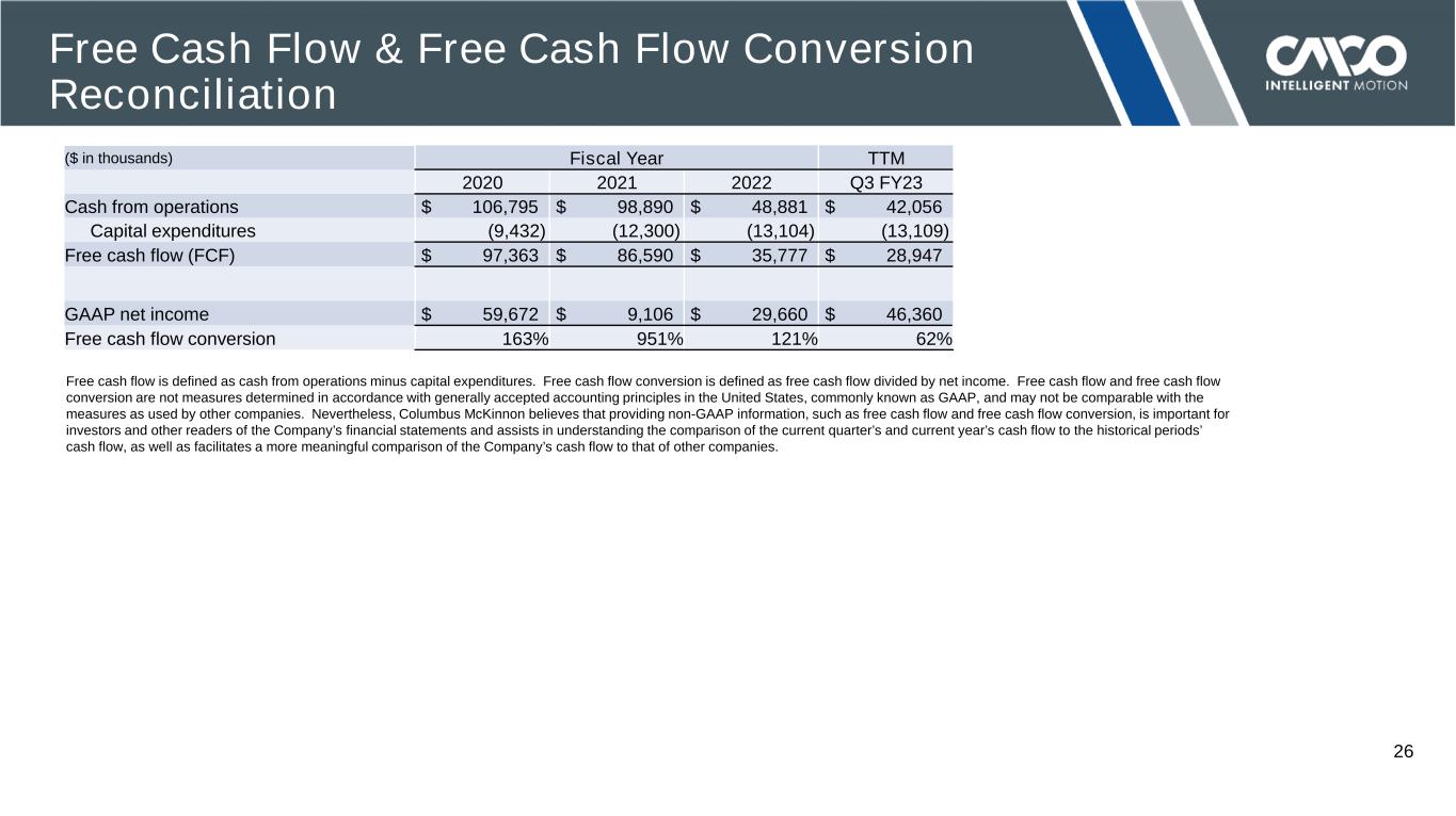 © 2023 COLUMBUS MCKINNON CORPORATION 25 Return on Invested Capital (ROIC) Reconciliation ROIC is defined as adjusted income from operations, net of taxes at a 22% normalized rate, for the trailing four quarters divided by the average of debt plus equity less cash (average capital) for the trailing five quarters. ROIC is not a measure determined in accordance with generally accepted accounting principles in the United States, commonly known as GAAP, and may not be comparable with the measures as used by other companies. Nevertheless, Columbus McKinnon believes that providing non-GAAP information, such as ROIC, is important for investors and other readers of the Company’s financial statements. ($ in thousands) Fiscal Year TTM 2021 2022 Q3 FY23 GAAP income from operations 42,255 73,781 94,427 Add back (deduct): Acquisition deal and integration costs 3,951 10,473 672 Acquisition inventory step-up expense — 5,042 1,546 Product liability settlement — 2,850 — Acquisition amortization of backlog — 2,100 1,650 Factory closures 3,778 — — Business realignment costs 1,470 3,902 5,406 Insurance recovery legal costs 229 — — Garvey contingent consideration — — 1,230 Headquarter relocation costs — — 315 Gain on sale of building (2,638) — — Non-GAAP adjusted income from operations $ 49,045 $ 98,148 $ 105,246 Non-GAAP adjusted income from operations, net of normalized tax rate of 22% $ 38,255 $ 76,555 $ 82,092 Trailing five quarter averages: Total debt 260,130 438,768 501,321 Total shareholders’ equity 487,523 701,640 777,777 Cash and cash equivalents 168,599 123,636 95,627 Net total capitalization $ 579,054 $ 1,016,772 $ 1,183,471 Return on invested capital (ROIC) – Non-GAAP 6.6% 7.5% 6.9%
