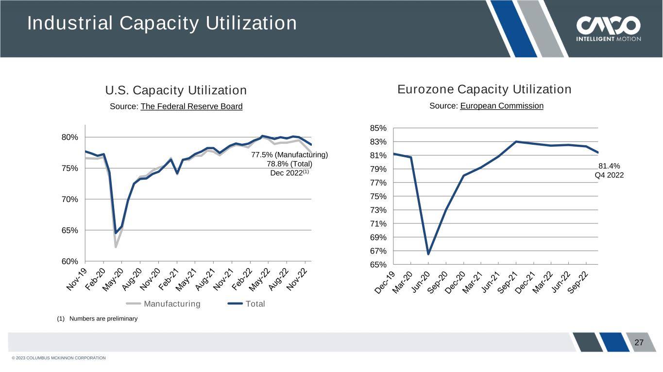 © 2023 COLUMBUS MCKINNON CORPORATION 27 U.S. Capacity Utilization Eurozone Capacity Utilization Industrial Capacity Utilization Source: The Federal Reserve Board Source: European Commission 60% 65% 70% 75% 80% Manufacturing Total 77.5% (Manufacturing) 78.8% (Total) Dec 2022(1) 65% 67% 69% 71% 73% 75% 77% 79% 81% 83% 85% 81.4% Q4 2022 (1) Numbers are preliminary