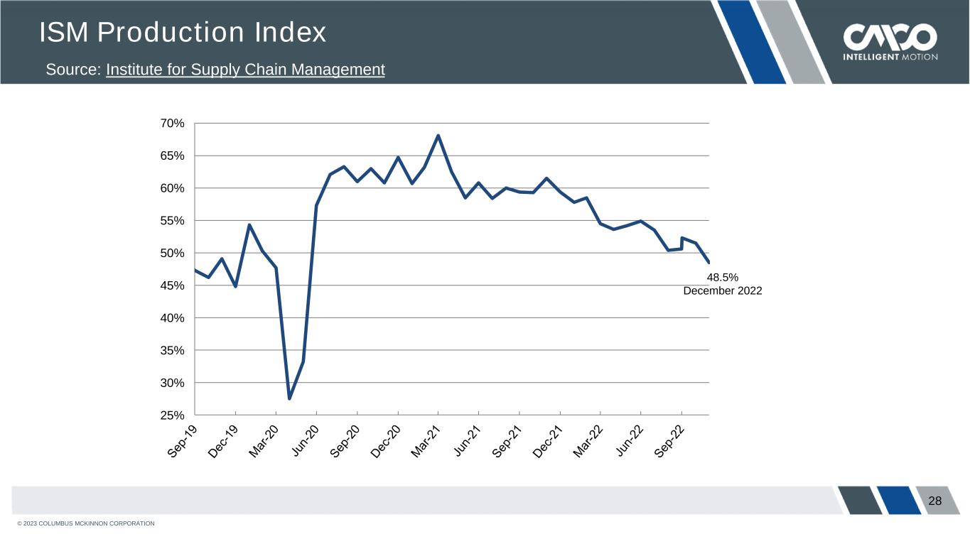 © 2023 COLUMBUS MCKINNON CORPORATION 28 ISM Production Index Source: Institute for Supply Chain Management 25% 30% 35% 40% 45% 50% 55% 60% 65% 70% 48.5% December 2022