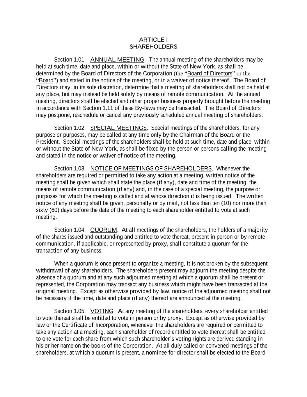 ARTICLE I SHAREHOLDERS Section 1.01. ANNUAL MEETING. The annual meeting of the shareholders may be held at such time, date and place, within or without the State of New York, as shall be determined by the Board of Directors of the Corporation (the “Board of Directors” or the “Board”) and stated in the notice of the meeting, or in a waiver of notice thereof. The Board of Directors may, in its sole discretion, determine that a meeting of shareholders shall not be held at any place, but may instead be held solely by means of remote communication. At the annual meeting, directors shall be elected and other proper business properly brought before the meeting in accordance with Section 1.11 of these By-laws may be transacted. The Board of Directors may postpone, reschedule or cancel any previously scheduled annual meeting of shareholders. Section 1.02. SPECIAL MEETINGS. Special meetings of the shareholders, for any purpose or purposes, may be called at any time only by the Chairman of the Board or the President. Special meetings of the shareholders shall be held at such time, date and place, within or without the State of New York, as shall be fixed by the person or persons calling the meeting and stated in the notice or waiver of notice of the meeting. Section 1.03. NOTICE OF MEETINGS OF SHAREHOLDERS. Whenever the shareholders are required or permitted to take any action at a meeting, written notice of the meeting shall be given which shall state the place (if any), date and time of the meeting, the means of remote communication (if any) and, in the case of a special meeting, the purpose or purposes for which the meeting is called and at whose direction it is being issued. The written notice of any meeting shall be given, personally or by mail, not less than ten (10) nor more than sixty (60) days before the date of the meeting to each shareholder entitled to vote at such meeting. Section 1.04. QUORUM. At all meetings of the shareholders, the holders of a majority of the shares issued and outstanding and entitled to vote thereat, present in person or by remote communication, if applicable, or represented by proxy, shall constitute a quorum for the transaction of any business. When a quorum is once present to organize a meeting, it is not broken by the subsequent withdrawal of any shareholders. The shareholders present may adjourn the meeting despite the absence of a quorum and at any such adjourned meeting at which a quorum shall be present or represented, the Corporation may transact any business which might have been transacted at the original meeting. Except as otherwise provided by law, notice of the adjourned meeting shall not be necessary if the time, date and place (if any) thereof are announced at the meeting. Section 1.05. VOTING. At any meeting of the shareholders, every shareholder entitled to vote thereat shall be entitled to vote in person or by proxy. Except as otherwise provided by law or the Certificate of Incorporation, whenever the shareholders are required or permitted to take any action at a meeting, each shareholder of record entitled to vote thereat shall be entitled to one vote for each share from which such shareholder’s voting rights are derived standing in his or her name on the books of the Corporation. At all duly called or convened meetings of the shareholders, at which a quorum is present, a nominee for director shall be elected to the Board