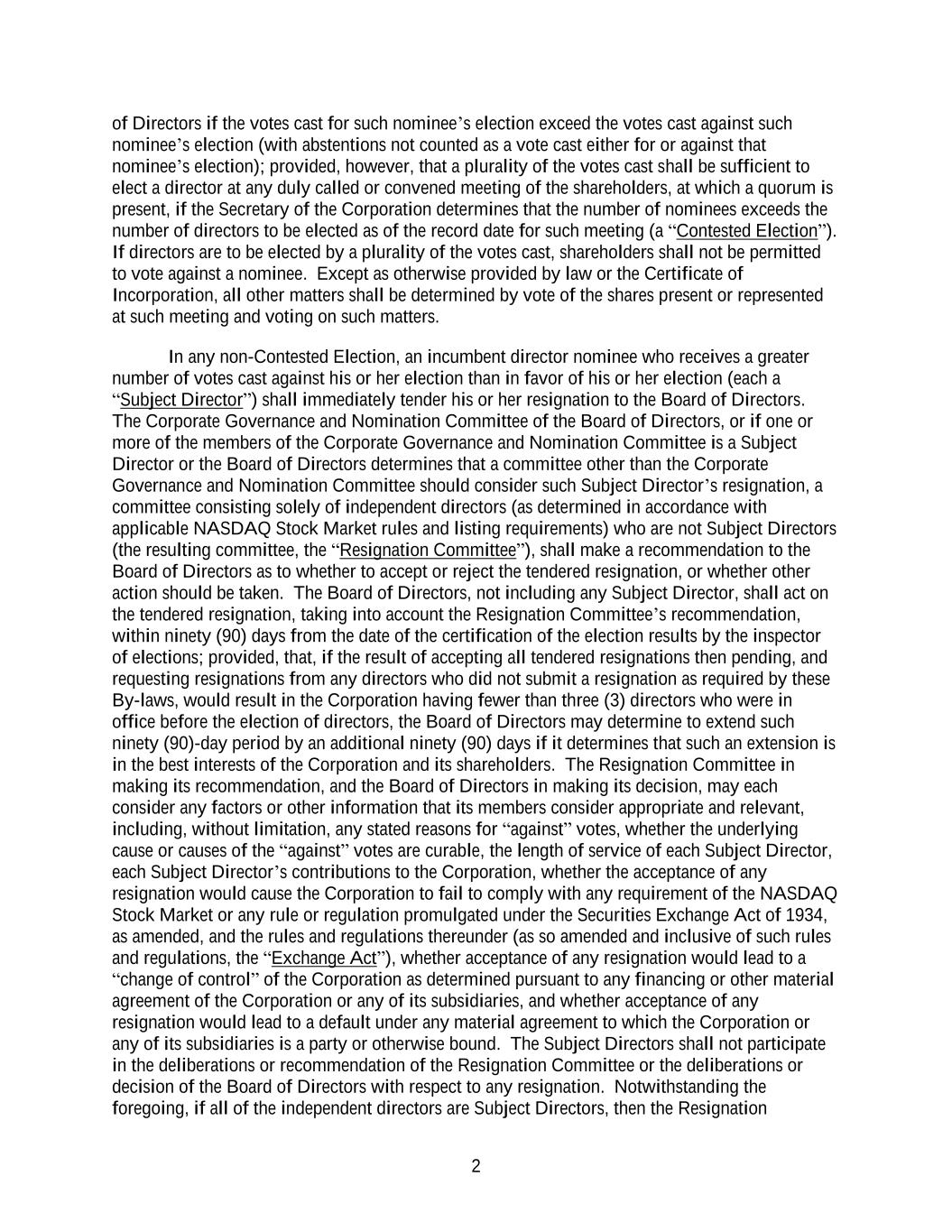 2 of Directors if the votes cast for such nominee’s election exceed the votes cast against such nominee’s election (with abstentions not counted as a vote cast either for or against that nominee’s election); provided, however, that a plurality of the votes cast shall be sufficient to elect a director at any duly called or convened meeting of the shareholders, at which a quorum is present, if the Secretary of the Corporation determines that the number of nominees exceeds the number of directors to be elected as of the record date for such meeting (a “Contested Election”). If directors are to be elected by a plurality of the votes cast, shareholders shall not be permitted to vote against a nominee. Except as otherwise provided by law or the Certificate of Incorporation, all other matters shall be determined by vote of the shares present or represented at such meeting and voting on such matters. In any non-Contested Election, an incumbent director nominee who receives a greater number of votes cast against his or her election than in favor of his or her election (each a “Subject Director”) shall immediately tender his or her resignation to the Board of Directors. The Corporate Governance and Nomination Committee of the Board of Directors, or if one or more of the members of the Corporate Governance and Nomination Committee is a Subject Director or the Board of Directors determines that a committee other than the Corporate Governance and Nomination Committee should consider such Subject Director’s resignation, a committee consisting solely of independent directors (as determined in accordance with applicable NASDAQ Stock Market rules and listing requirements) who are not Subject Directors (the resulting committee, the “Resignation Committee”), shall make a recommendation to the Board of Directors as to whether to accept or reject the tendered resignation, or whether other action should be taken. The Board of Directors, not including any Subject Director, shall act on the tendered resignation, taking into account the Resignation Committee’s recommendation, within ninety (90) days from the date of the certification of the election results by the inspector of elections; provided, that, if the result of accepting all tendered resignations then pending, and requesting resignations from any directors who did not submit a resignation as required by these By-laws, would result in the Corporation having fewer than three (3) directors who were in office before the election of directors, the Board of Directors may determine to extend such ninety (90)-day period by an additional ninety (90) days if it determines that such an extension is in the best interests of the Corporation and its shareholders. The Resignation Committee in making its recommendation, and the Board of Directors in making its decision, may each consider any factors or other information that its members consider appropriate and relevant, including, without limitation, any stated reasons for “against” votes, whether the underlying cause or causes of the “against” votes are curable, the length of service of each Subject Director, each Subject Director’s contributions to the Corporation, whether the acceptance of any resignation would cause the Corporation to fail to comply with any requirement of the NASDAQ Stock Market or any rule or regulation promulgated under the Securities Exchange Act of 1934, as amended, and the rules and regulations thereunder (as so amended and inclusive of such rules and regulations, the “Exchange Act”), whether acceptance of any resignation would lead to a “change of control” of the Corporation as determined pursuant to any financing or other material agreement of the Corporation or any of its subsidiaries, and whether acceptance of any resignation would lead to a default under any material agreement to which the Corporation or any of its subsidiaries is a party or otherwise bound. The Subject Directors shall not participate in the deliberations or recommendation of the Resignation Committee or the deliberations or decision of the Board of Directors with respect to any resignation. Notwithstanding the foregoing, if all of the independent directors are Subject Directors, then the Resignation