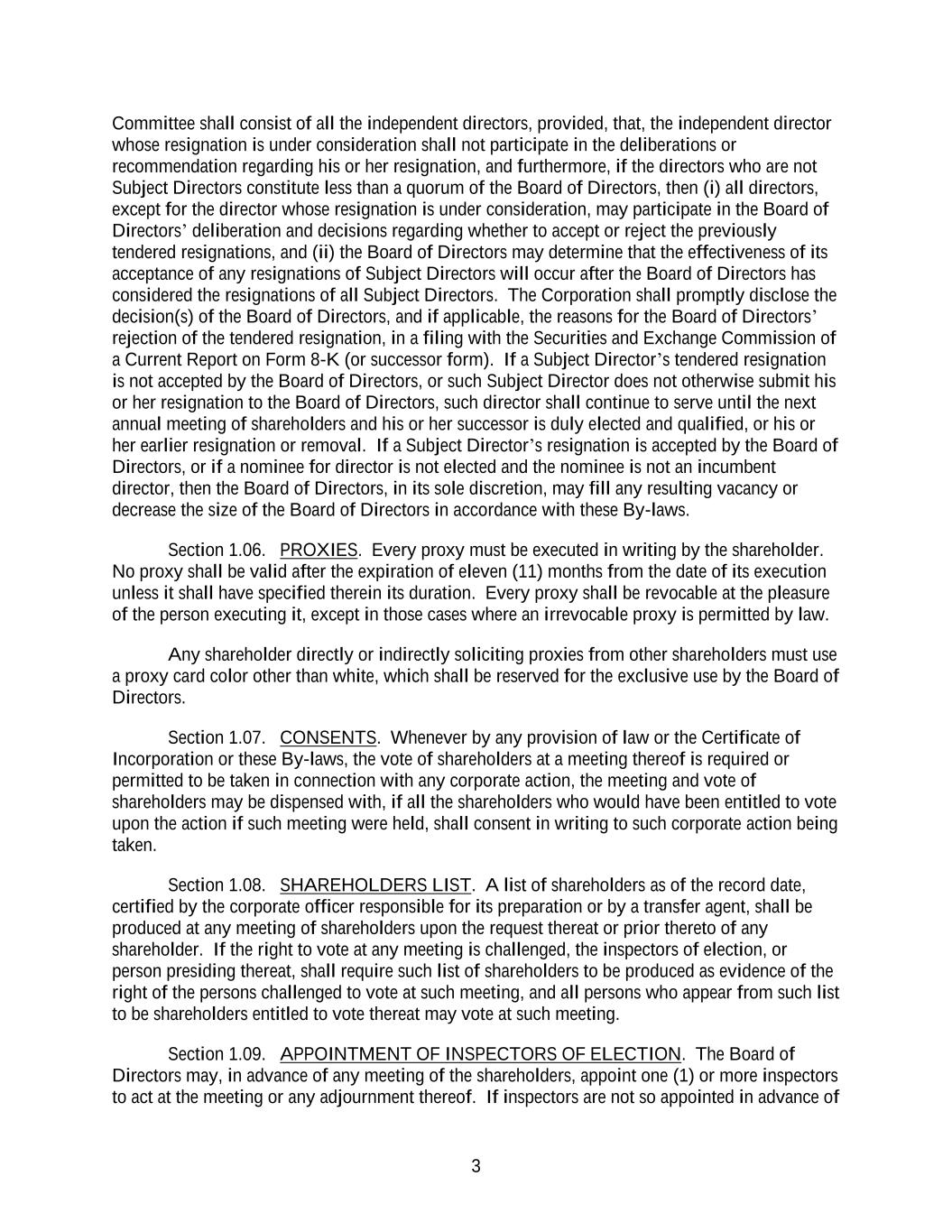 3 Committee shall consist of all the independent directors, provided, that, the independent director whose resignation is under consideration shall not participate in the deliberations or recommendation regarding his or her resignation, and furthermore, if the directors who are not Subject Directors constitute less than a quorum of the Board of Directors, then (i) all directors, except for the director whose resignation is under consideration, may participate in the Board of Directors’ deliberation and decisions regarding whether to accept or reject the previously tendered resignations, and (ii) the Board of Directors may determine that the effectiveness of its acceptance of any resignations of Subject Directors will occur after the Board of Directors has considered the resignations of all Subject Directors. The Corporation shall promptly disclose the decision(s) of the Board of Directors, and if applicable, the reasons for the Board of Directors’ rejection of the tendered resignation, in a filing with the Securities and Exchange Commission of a Current Report on Form 8-K (or successor form). If a Subject Director’s tendered resignation is not accepted by the Board of Directors, or such Subject Director does not otherwise submit his or her resignation to the Board of Directors, such director shall continue to serve until the next annual meeting of shareholders and his or her successor is duly elected and qualified, or his or her earlier resignation or removal. If a Subject Director’s resignation is accepted by the Board of Directors, or if a nominee for director is not elected and the nominee is not an incumbent director, then the Board of Directors, in its sole discretion, may fill any resulting vacancy or decrease the size of the Board of Directors in accordance with these By-laws. Section 1.06. PROXIES. Every proxy must be executed in writing by the shareholder. No proxy shall be valid after the expiration of eleven (11) months from the date of its execution unless it shall have specified therein its duration. Every proxy shall be revocable at the pleasure of the person executing it, except in those cases where an irrevocable proxy is permitted by law. Any shareholder directly or indirectly soliciting proxies from other shareholders must use a proxy card color other than white, which shall be reserved for the exclusive use by the Board of Directors. Section 1.07. CONSENTS. Whenever by any provision of law or the Certificate of Incorporation or these By-laws, the vote of shareholders at a meeting thereof is required or permitted to be taken in connection with any corporate action, the meeting and vote of shareholders may be dispensed with, if all the shareholders who would have been entitled to vote upon the action if such meeting were held, shall consent in writing to such corporate action being taken. Section 1.08. SHAREHOLDERS LIST. A list of shareholders as of the record date, certified by the corporate officer responsible for its preparation or by a transfer agent, shall be produced at any meeting of shareholders upon the request thereat or prior thereto of any shareholder. If the right to vote at any meeting is challenged, the inspectors of election, or person presiding thereat, shall require such list of shareholders to be produced as evidence of the right of the persons challenged to vote at such meeting, and all persons who appear from such list to be shareholders entitled to vote thereat may vote at such meeting. Section 1.09. APPOINTMENT OF INSPECTORS OF ELECTION. The Board of Directors may, in advance of any meeting of the shareholders, appoint one (1) or more inspectors to act at the meeting or any adjournment thereof. If inspectors are not so appointed in advance of