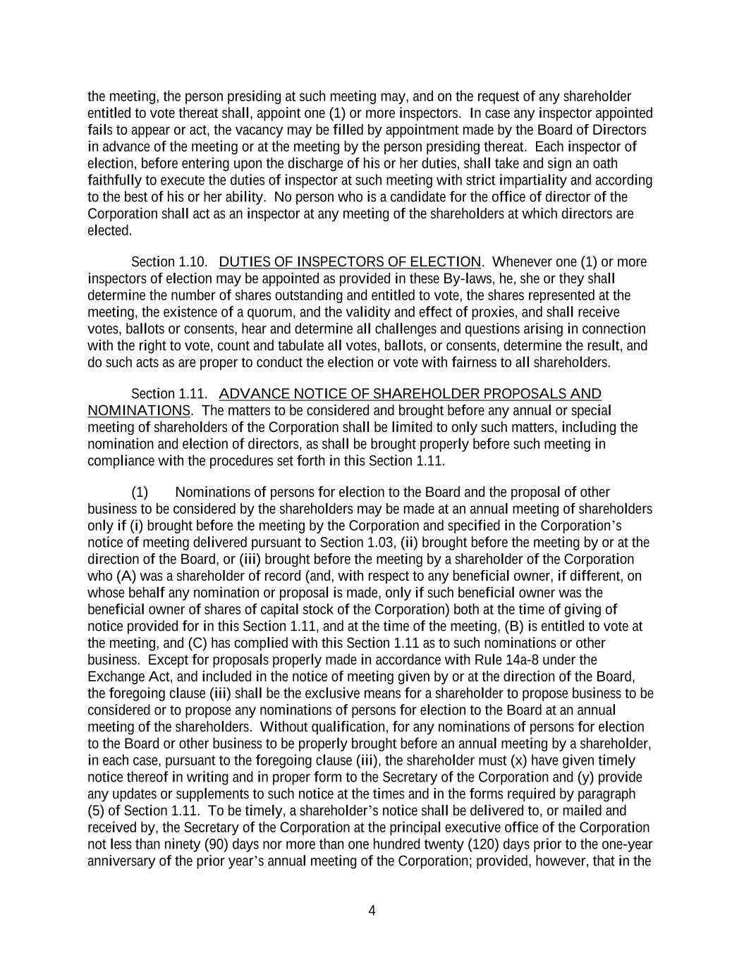 4 the meeting, the person presiding at such meeting may, and on the request of any shareholder entitled to vote thereat shall, appoint one (1) or more inspectors. In case any inspector appointed fails to appear or act, the vacancy may be filled by appointment made by the Board of Directors in advance of the meeting or at the meeting by the person presiding thereat. Each inspector of election, before entering upon the discharge of his or her duties, shall take and sign an oath faithfully to execute the duties of inspector at such meeting with strict impartiality and according to the best of his or her ability. No person who is a candidate for the office of director of the Corporation shall act as an inspector at any meeting of the shareholders at which directors are elected. Section 1.10. DUTIES OF INSPECTORS OF ELECTION. Whenever one (1) or more inspectors of election may be appointed as provided in these By-laws, he, she or they shall determine the number of shares outstanding and entitled to vote, the shares represented at the meeting, the existence of a quorum, and the validity and effect of proxies, and shall receive votes, ballots or consents, hear and determine all challenges and questions arising in connection with the right to vote, count and tabulate all votes, ballots, or consents, determine the result, and do such acts as are proper to conduct the election or vote with fairness to all shareholders. Section 1.11. ADVANCE NOTICE OF SHAREHOLDER PROPOSALS AND NOMINATIONS. The matters to be considered and brought before any annual or special meeting of shareholders of the Corporation shall be limited to only such matters, including the nomination and election of directors, as shall be brought properly before such meeting in compliance with the procedures set forth in this Section 1.11. (1) Nominations of persons for election to the Board and the proposal of other business to be considered by the shareholders may be made at an annual meeting of shareholders only if (i) brought before the meeting by the Corporation and specified in the Corporation’s notice of meeting delivered pursuant to Section 1.03, (ii) brought before the meeting by or at the direction of the Board, or (iii) brought before the meeting by a shareholder of the Corporation who (A) was a shareholder of record (and, with respect to any beneficial owner, if different, on whose behalf any nomination or proposal is made, only if such beneficial owner was the beneficial owner of shares of capital stock of the Corporation) both at the time of giving of notice provided for in this Section 1.11, and at the time of the meeting, (B) is entitled to vote at the meeting, and (C) has complied with this Section 1.11 as to such nominations or other business. Except for proposals properly made in accordance with Rule 14a-8 under the Exchange Act, and included in the notice of meeting given by or at the direction of the Board, the foregoing clause (iii) shall be the exclusive means for a shareholder to propose business to be considered or to propose any nominations of persons for election to the Board at an annual meeting of the shareholders. Without qualification, for any nominations of persons for election to the Board or other business to be properly brought before an annual meeting by a shareholder, in each case, pursuant to the foregoing clause (iii), the shareholder must (x) have given timely notice thereof in writing and in proper form to the Secretary of the Corporation and (y) provide any updates or supplements to such notice at the times and in the forms required by paragraph (5) of Section 1.11. To be timely, a shareholder’s notice shall be delivered to, or mailed and received by, the Secretary of the Corporation at the principal executive office of the Corporation not less than ninety (90) days nor more than one hundred twenty (120) days prior to the one-year anniversary of the prior year’s annual meeting of the Corporation; provided, however, that in the