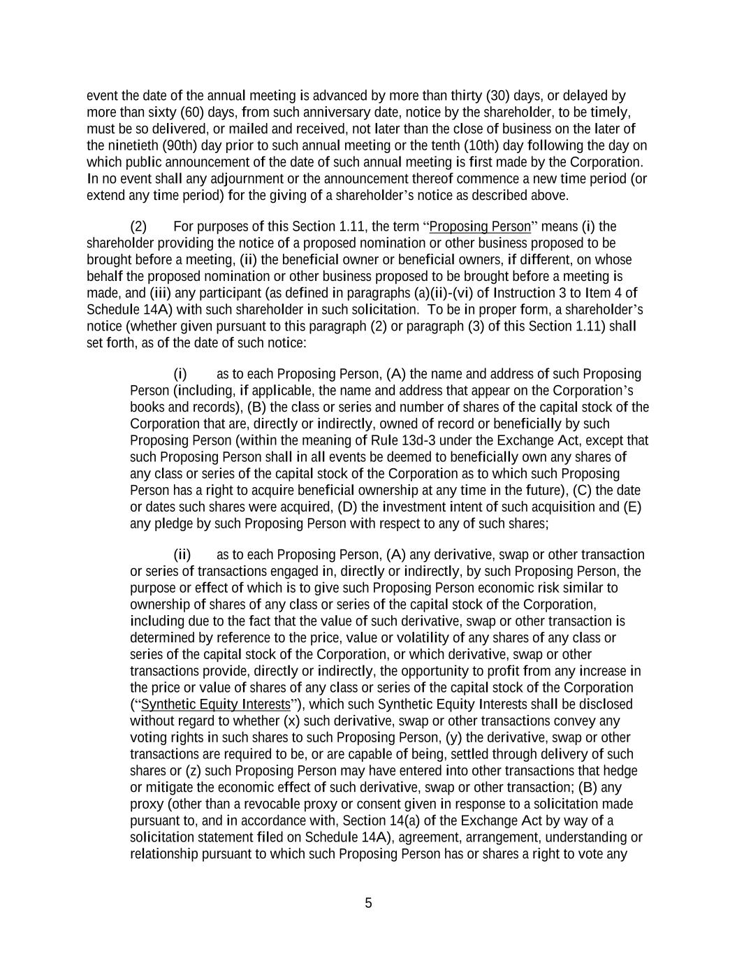 5 event the date of the annual meeting is advanced by more than thirty (30) days, or delayed by more than sixty (60) days, from such anniversary date, notice by the shareholder, to be timely, must be so delivered, or mailed and received, not later than the close of business on the later of the ninetieth (90th) day prior to such annual meeting or the tenth (10th) day following the day on which public announcement of the date of such annual meeting is first made by the Corporation. In no event shall any adjournment or the announcement thereof commence a new time period (or extend any time period) for the giving of a shareholder’s notice as described above. (2) For purposes of this Section 1.11, the term “Proposing Person” means (i) the shareholder providing the notice of a proposed nomination or other business proposed to be brought before a meeting, (ii) the beneficial owner or beneficial owners, if different, on whose behalf the proposed nomination or other business proposed to be brought before a meeting is made, and (iii) any participant (as defined in paragraphs (a)(ii)-(vi) of Instruction 3 to Item 4 of Schedule 14A) with such shareholder in such solicitation. To be in proper form, a shareholder’s notice (whether given pursuant to this paragraph (2) or paragraph (3) of this Section 1.11) shall set forth, as of the date of such notice: (i) as to each Proposing Person, (A) the name and address of such Proposing Person (including, if applicable, the name and address that appear on the Corporation’s books and records), (B) the class or series and number of shares of the capital stock of the Corporation that are, directly or indirectly, owned of record or beneficially by such Proposing Person (within the meaning of Rule 13d-3 under the Exchange Act, except that such Proposing Person shall in all events be deemed to beneficially own any shares of any class or series of the capital stock of the Corporation as to which such Proposing Person has a right to acquire beneficial ownership at any time in the future), (C) the date or dates such shares were acquired, (D) the investment intent of such acquisition and (E) any pledge by such Proposing Person with respect to any of such shares; (ii) as to each Proposing Person, (A) any derivative, swap or other transaction or series of transactions engaged in, directly or indirectly, by such Proposing Person, the purpose or effect of which is to give such Proposing Person economic risk similar to ownership of shares of any class or series of the capital stock of the Corporation, including due to the fact that the value of such derivative, swap or other transaction is determined by reference to the price, value or volatility of any shares of any class or series of the capital stock of the Corporation, or which derivative, swap or other transactions provide, directly or indirectly, the opportunity to profit from any increase in the price or value of shares of any class or series of the capital stock of the Corporation (“Synthetic Equity Interests”), which such Synthetic Equity Interests shall be disclosed without regard to whether (x) such derivative, swap or other transactions convey any voting rights in such shares to such Proposing Person, (y) the derivative, swap or other transactions are required to be, or are capable of being, settled through delivery of such shares or (z) such Proposing Person may have entered into other transactions that hedge or mitigate the economic effect of such derivative, swap or other transaction; (B) any proxy (other than a revocable proxy or consent given in response to a solicitation made pursuant to, and in accordance with, Section 14(a) of the Exchange Act by way of a solicitation statement filed on Schedule 14A), agreement, arrangement, understanding or relationship pursuant to which such Proposing Person has or shares a right to vote any