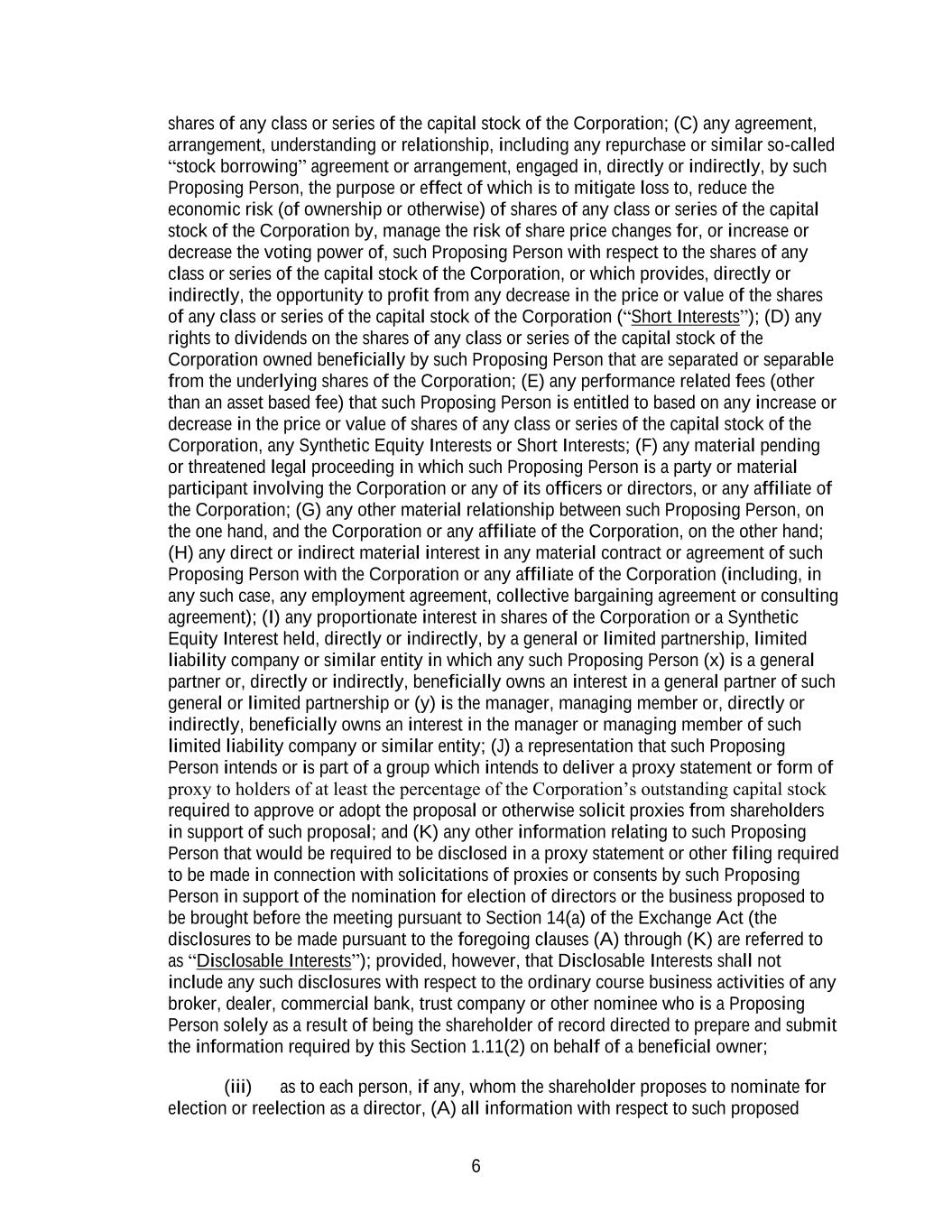 6 shares of any class or series of the capital stock of the Corporation; (C) any agreement, arrangement, understanding or relationship, including any repurchase or similar so-called “stock borrowing” agreement or arrangement, engaged in, directly or indirectly, by such Proposing Person, the purpose or effect of which is to mitigate loss to, reduce the economic risk (of ownership or otherwise) of shares of any class or series of the capital stock of the Corporation by, manage the risk of share price changes for, or increase or decrease the voting power of, such Proposing Person with respect to the shares of any class or series of the capital stock of the Corporation, or which provides, directly or indirectly, the opportunity to profit from any decrease in the price or value of the shares of any class or series of the capital stock of the Corporation (“Short Interests”); (D) any rights to dividends on the shares of any class or series of the capital stock of the Corporation owned beneficially by such Proposing Person that are separated or separable from the underlying shares of the Corporation; (E) any performance related fees (other than an asset based fee) that such Proposing Person is entitled to based on any increase or decrease in the price or value of shares of any class or series of the capital stock of the Corporation, any Synthetic Equity Interests or Short Interests; (F) any material pending or threatened legal proceeding in which such Proposing Person is a party or material participant involving the Corporation or any of its officers or directors, or any affiliate of the Corporation; (G) any other material relationship between such Proposing Person, on the one hand, and the Corporation or any affiliate of the Corporation, on the other hand; (H) any direct or indirect material interest in any material contract or agreement of such Proposing Person with the Corporation or any affiliate of the Corporation (including, in any such case, any employment agreement, collective bargaining agreement or consulting agreement); (I) any proportionate interest in shares of the Corporation or a Synthetic Equity Interest held, directly or indirectly, by a general or limited partnership, limited liability company or similar entity in which any such Proposing Person (x) is a general partner or, directly or indirectly, beneficially owns an interest in a general partner of such general or limited partnership or (y) is the manager, managing member or, directly or indirectly, beneficially owns an interest in the manager or managing member of such limited liability company or similar entity; (J) a representation that such Proposing Person intends or is part of a group which intends to deliver a proxy statement or form of proxy to holders of at least the percentage of the Corporation’s outstanding capital stock required to approve or adopt the proposal or otherwise solicit proxies from shareholders in support of such proposal; and (K) any other information relating to such Proposing Person that would be required to be disclosed in a proxy statement or other filing required to be made in connection with solicitations of proxies or consents by such Proposing Person in support of the nomination for election of directors or the business proposed to be brought before the meeting pursuant to Section 14(a) of the Exchange Act (the disclosures to be made pursuant to the foregoing clauses (A) through (K) are referred to as “Disclosable Interests”); provided, however, that Disclosable Interests shall not include any such disclosures with respect to the ordinary course business activities of any broker, dealer, commercial bank, trust company or other nominee who is a Proposing Person solely as a result of being the shareholder of record directed to prepare and submit the information required by this Section 1.11(2) on behalf of a beneficial owner; (iii) as to each person, if any, whom the shareholder proposes to nominate for election or reelection as a director, (A) all information with respect to such proposed