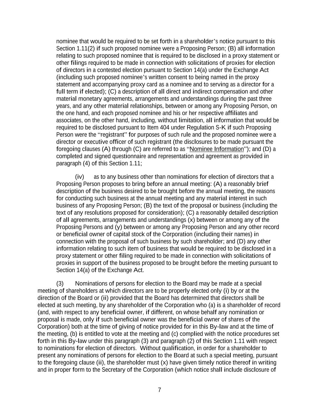 7 nominee that would be required to be set forth in a shareholder’s notice pursuant to this Section 1.11(2) if such proposed nominee were a Proposing Person; (B) all information relating to such proposed nominee that is required to be disclosed in a proxy statement or other filings required to be made in connection with solicitations of proxies for election of directors in a contested election pursuant to Section 14(a) under the Exchange Act (including such proposed nominee’s written consent to being named in the proxy statement and accompanying proxy card as a nominee and to serving as a director for a full term if elected); (C) a description of all direct and indirect compensation and other material monetary agreements, arrangements and understandings during the past three years, and any other material relationships, between or among any Proposing Person, on the one hand, and each proposed nominee and his or her respective affiliates and associates, on the other hand, including, without limitation, all information that would be required to be disclosed pursuant to Item 404 under Regulation S-K if such Proposing Person were the “registrant” for purposes of such rule and the proposed nominee were a director or executive officer of such registrant (the disclosures to be made pursuant the foregoing clauses (A) through (C) are referred to as “Nominee Information”); and (D) a completed and signed questionnaire and representation and agreement as provided in paragraph (4) of this Section 1.11; (iv) as to any business other than nominations for election of directors that a Proposing Person proposes to bring before an annual meeting: (A) a reasonably brief description of the business desired to be brought before the annual meeting, the reasons for conducting such business at the annual meeting and any material interest in such business of any Proposing Person; (B) the text of the proposal or business (including the text of any resolutions proposed for consideration); (C) a reasonably detailed description of all agreements, arrangements and understandings (x) between or among any of the Proposing Persons and (y) between or among any Proposing Person and any other record or beneficial owner of capital stock of the Corporation (including their names) in connection with the proposal of such business by such shareholder; and (D) any other information relating to such item of business that would be required to be disclosed in a proxy statement or other filing required to be made in connection with solicitations of proxies in support of the business proposed to be brought before the meeting pursuant to Section 14(a) of the Exchange Act. (3) Nominations of persons for election to the Board may be made at a special meeting of shareholders at which directors are to be properly elected only (i) by or at the direction of the Board or (ii) provided that the Board has determined that directors shall be elected at such meeting, by any shareholder of the Corporation who (a) is a shareholder of record (and, with respect to any beneficial owner, if different, on whose behalf any nomination or proposal is made, only if such beneficial owner was the beneficial owner of shares of the Corporation) both at the time of giving of notice provided for in this By-law and at the time of the meeting, (b) is entitled to vote at the meeting and (c) complied with the notice procedures set forth in this By-law under this paragraph (3) and paragraph (2) of this Section 1.11 with respect to nominations for election of directors. Without qualification, in order for a shareholder to present any nominations of persons for election to the Board at such a special meeting, pursuant to the foregoing clause (ii), the shareholder must (x) have given timely notice thereof in writing and in proper form to the Secretary of the Corporation (which notice shall include disclosure of