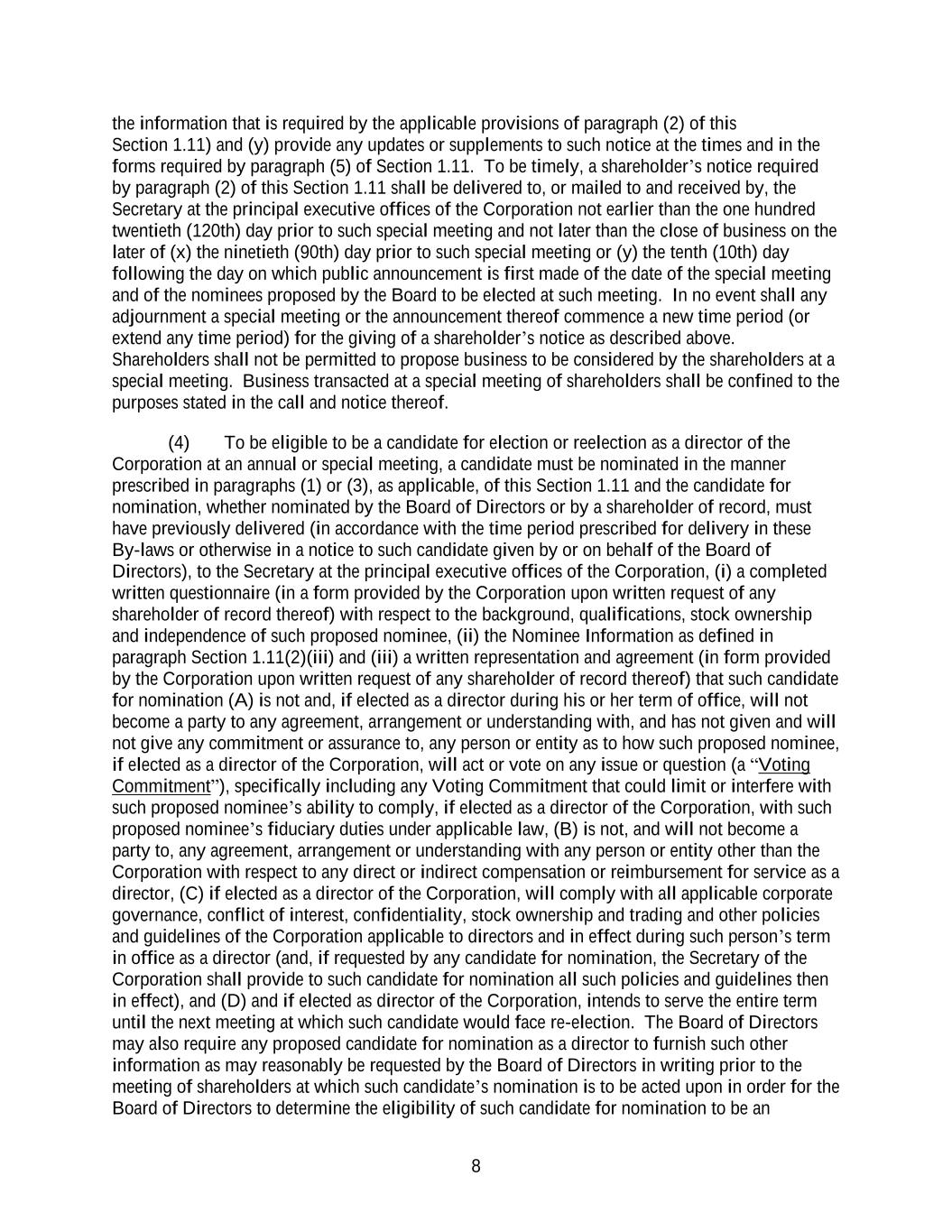 8 the information that is required by the applicable provisions of paragraph (2) of this Section 1.11) and (y) provide any updates or supplements to such notice at the times and in the forms required by paragraph (5) of Section 1.11. To be timely, a shareholder’s notice required by paragraph (2) of this Section 1.11 shall be delivered to, or mailed to and received by, the Secretary at the principal executive offices of the Corporation not earlier than the one hundred twentieth (120th) day prior to such special meeting and not later than the close of business on the later of (x) the ninetieth (90th) day prior to such special meeting or (y) the tenth (10th) day following the day on which public announcement is first made of the date of the special meeting and of the nominees proposed by the Board to be elected at such meeting. In no event shall any adjournment a special meeting or the announcement thereof commence a new time period (or extend any time period) for the giving of a shareholder’s notice as described above. Shareholders shall not be permitted to propose business to be considered by the shareholders at a special meeting. Business transacted at a special meeting of shareholders shall be confined to the purposes stated in the call and notice thereof. (4) To be eligible to be a candidate for election or reelection as a director of the Corporation at an annual or special meeting, a candidate must be nominated in the manner prescribed in paragraphs (1) or (3), as applicable, of this Section 1.11 and the candidate for nomination, whether nominated by the Board of Directors or by a shareholder of record, must have previously delivered (in accordance with the time period prescribed for delivery in these By-laws or otherwise in a notice to such candidate given by or on behalf of the Board of Directors), to the Secretary at the principal executive offices of the Corporation, (i) a completed written questionnaire (in a form provided by the Corporation upon written request of any shareholder of record thereof) with respect to the background, qualifications, stock ownership and independence of such proposed nominee, (ii) the Nominee Information as defined in paragraph Section 1.11(2)(iii) and (iii) a written representation and agreement (in form provided by the Corporation upon written request of any shareholder of record thereof) that such candidate for nomination (A) is not and, if elected as a director during his or her term of office, will not become a party to any agreement, arrangement or understanding with, and has not given and will not give any commitment or assurance to, any person or entity as to how such proposed nominee, if elected as a director of the Corporation, will act or vote on any issue or question (a “Voting Commitment”), specifically including any Voting Commitment that could limit or interfere with such proposed nominee’s ability to comply, if elected as a director of the Corporation, with such proposed nominee’s fiduciary duties under applicable law, (B) is not, and will not become a party to, any agreement, arrangement or understanding with any person or entity other than the Corporation with respect to any direct or indirect compensation or reimbursement for service as a director, (C) if elected as a director of the Corporation, will comply with all applicable corporate governance, conflict of interest, confidentiality, stock ownership and trading and other policies and guidelines of the Corporation applicable to directors and in effect during such person’s term in office as a director (and, if requested by any candidate for nomination, the Secretary of the Corporation shall provide to such candidate for nomination all such policies and guidelines then in effect), and (D) and if elected as director of the Corporation, intends to serve the entire term until the next meeting at which such candidate would face re-election. The Board of Directors may also require any proposed candidate for nomination as a director to furnish such other information as may reasonably be requested by the Board of Directors in writing prior to the meeting of shareholders at which such candidate’s nomination is to be acted upon in order for the Board of Directors to determine the eligibility of such candidate for nomination to be an