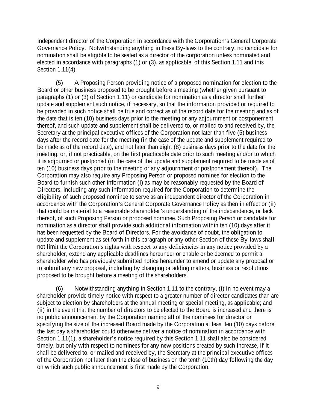 9 independent director of the Corporation in accordance with the Corporation’s General Corporate Governance Policy. Notwithstanding anything in these By-laws to the contrary, no candidate for nomination shall be eligible to be seated as a director of the corporation unless nominated and elected in accordance with paragraphs (1) or (3), as applicable, of this Section 1.11 and this Section 1.11(4). (5) A Proposing Person providing notice of a proposed nomination for election to the Board or other business proposed to be brought before a meeting (whether given pursuant to paragraphs (1) or (3) of Section 1.11) or candidate for nomination as a director shall further update and supplement such notice, if necessary, so that the information provided or required to be provided in such notice shall be true and correct as of the record date for the meeting and as of the date that is ten (10) business days prior to the meeting or any adjournment or postponement thereof, and such update and supplement shall be delivered to, or mailed to and received by, the Secretary at the principal executive offices of the Corporation not later than five (5) business days after the record date for the meeting (in the case of the update and supplement required to be made as of the record date), and not later than eight (8) business days prior to the date for the meeting, or, if not practicable, on the first practicable date prior to such meeting and/or to which it is adjourned or postponed (in the case of the update and supplement required to be made as of ten (10) business days prior to the meeting or any adjournment or postponement thereof). The Corporation may also require any Proposing Person or proposed nominee for election to the Board to furnish such other information (i) as may be reasonably requested by the Board of Directors, including any such information required for the Corporation to determine the eligibility of such proposed nominee to serve as an independent director of the Corporation in accordance with the Corporation’s General Corporate Governance Policy as then in effect or (ii) that could be material to a reasonable shareholder’s understanding of the independence, or lack thereof, of such Proposing Person or proposed nominee. Such Proposing Person or candidate for nomination as a director shall provide such additional information within ten (10) days after it has been requested by the Board of Directors. For the avoidance of doubt, the obligation to update and supplement as set forth in this paragraph or any other Section of these By-laws shall not limit the Corporation’s rights with respect to any deficiencies in any notice provided by a shareholder, extend any applicable deadlines hereunder or enable or be deemed to permit a shareholder who has previously submitted notice hereunder to amend or update any proposal or to submit any new proposal, including by changing or adding matters, business or resolutions proposed to be brought before a meeting of the shareholders. (6) Notwithstanding anything in Section 1.11 to the contrary, (i) in no event may a shareholder provide timely notice with respect to a greater number of director candidates than are subject to election by shareholders at the annual meeting or special meeting, as applicable; and (ii) in the event that the number of directors to be elected to the Board is increased and there is no public announcement by the Corporation naming all of the nominees for director or specifying the size of the increased Board made by the Corporation at least ten (10) days before the last day a shareholder could otherwise deliver a notice of nomination in accordance with Section 1.11(1), a shareholder’s notice required by this Section 1.11 shall also be considered timely, but only with respect to nominees for any new positions created by such increase, if it shall be delivered to, or mailed and received by, the Secretary at the principal executive offices of the Corporation not later than the close of business on the tenth (10th) day following the day on which such public announcement is first made by the Corporation.