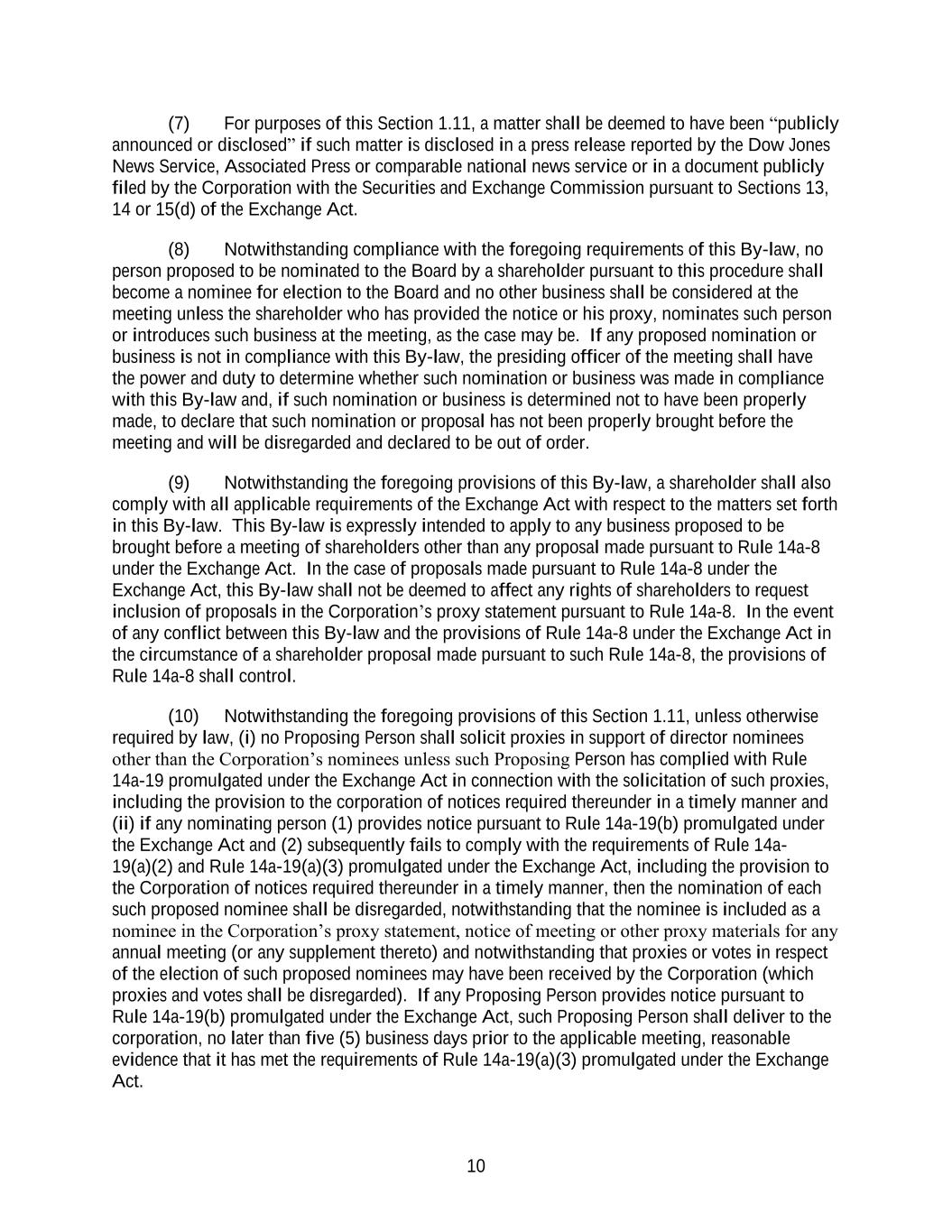 10 (7) For purposes of this Section 1.11, a matter shall be deemed to have been “publicly announced or disclosed” if such matter is disclosed in a press release reported by the Dow Jones News Service, Associated Press or comparable national news service or in a document publicly filed by the Corporation with the Securities and Exchange Commission pursuant to Sections 13, 14 or 15(d) of the Exchange Act. (8) Notwithstanding compliance with the foregoing requirements of this By-law, no person proposed to be nominated to the Board by a shareholder pursuant to this procedure shall become a nominee for election to the Board and no other business shall be considered at the meeting unless the shareholder who has provided the notice or his proxy, nominates such person or introduces such business at the meeting, as the case may be. If any proposed nomination or business is not in compliance with this By-law, the presiding officer of the meeting shall have the power and duty to determine whether such nomination or business was made in compliance with this By-law and, if such nomination or business is determined not to have been properly made, to declare that such nomination or proposal has not been properly brought before the meeting and will be disregarded and declared to be out of order. (9) Notwithstanding the foregoing provisions of this By-law, a shareholder shall also comply with all applicable requirements of the Exchange Act with respect to the matters set forth in this By-law. This By-law is expressly intended to apply to any business proposed to be brought before a meeting of shareholders other than any proposal made pursuant to Rule 14a-8 under the Exchange Act. In the case of proposals made pursuant to Rule 14a-8 under the Exchange Act, this By-law shall not be deemed to affect any rights of shareholders to request inclusion of proposals in the Corporation’s proxy statement pursuant to Rule 14a-8. In the event of any conflict between this By-law and the provisions of Rule 14a-8 under the Exchange Act in the circumstance of a shareholder proposal made pursuant to such Rule 14a-8, the provisions of Rule 14a-8 shall control. (10) Notwithstanding the foregoing provisions of this Section 1.11, unless otherwise required by law, (i) no Proposing Person shall solicit proxies in support of director nominees other than the Corporation’s nominees unless such Proposing Person has complied with Rule 14a-19 promulgated under the Exchange Act in connection with the solicitation of such proxies, including the provision to the corporation of notices required thereunder in a timely manner and (ii) if any nominating person (1) provides notice pursuant to Rule 14a-19(b) promulgated under the Exchange Act and (2) subsequently fails to comply with the requirements of Rule 14a- 19(a)(2) and Rule 14a-19(a)(3) promulgated under the Exchange Act, including the provision to the Corporation of notices required thereunder in a timely manner, then the nomination of each such proposed nominee shall be disregarded, notwithstanding that the nominee is included as a nominee in the Corporation’s proxy statement, notice of meeting or other proxy materials for any annual meeting (or any supplement thereto) and notwithstanding that proxies or votes in respect of the election of such proposed nominees may have been received by the Corporation (which proxies and votes shall be disregarded). If any Proposing Person provides notice pursuant to Rule 14a-19(b) promulgated under the Exchange Act, such Proposing Person shall deliver to the corporation, no later than five (5) business days prior to the applicable meeting, reasonable evidence that it has met the requirements of Rule 14a-19(a)(3) promulgated under the Exchange Act.