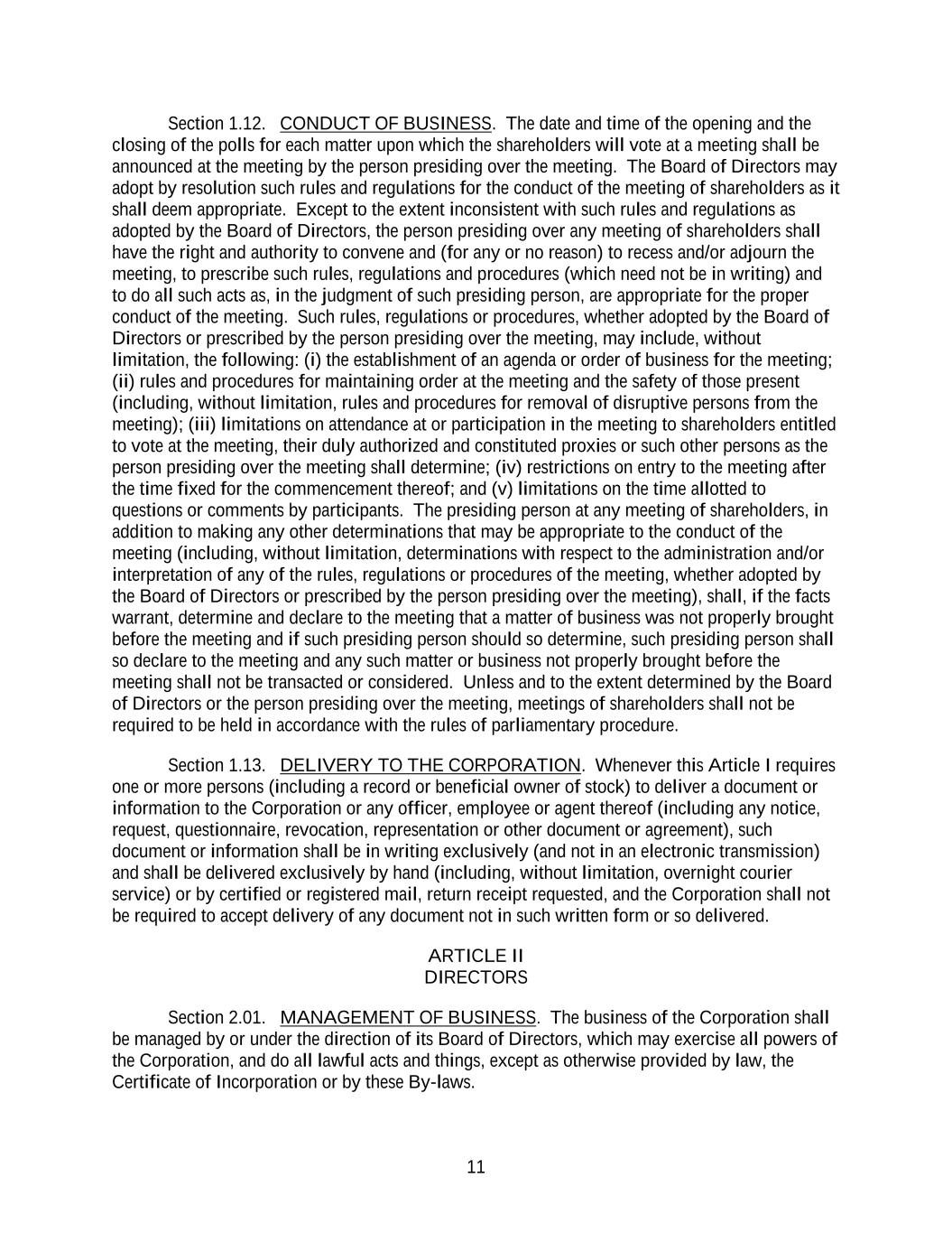 11 Section 1.12. CONDUCT OF BUSINESS. The date and time of the opening and the closing of the polls for each matter upon which the shareholders will vote at a meeting shall be announced at the meeting by the person presiding over the meeting. The Board of Directors may adopt by resolution such rules and regulations for the conduct of the meeting of shareholders as it shall deem appropriate. Except to the extent inconsistent with such rules and regulations as adopted by the Board of Directors, the person presiding over any meeting of shareholders shall have the right and authority to convene and (for any or no reason) to recess and/or adjourn the meeting, to prescribe such rules, regulations and procedures (which need not be in writing) and to do all such acts as, in the judgment of such presiding person, are appropriate for the proper conduct of the meeting. Such rules, regulations or procedures, whether adopted by the Board of Directors or prescribed by the person presiding over the meeting, may include, without limitation, the following: (i) the establishment of an agenda or order of business for the meeting; (ii) rules and procedures for maintaining order at the meeting and the safety of those present (including, without limitation, rules and procedures for removal of disruptive persons from the meeting); (iii) limitations on attendance at or participation in the meeting to shareholders entitled to vote at the meeting, their duly authorized and constituted proxies or such other persons as the person presiding over the meeting shall determine; (iv) restrictions on entry to the meeting after the time fixed for the commencement thereof; and (v) limitations on the time allotted to questions or comments by participants. The presiding person at any meeting of shareholders, in addition to making any other determinations that may be appropriate to the conduct of the meeting (including, without limitation, determinations with respect to the administration and/or interpretation of any of the rules, regulations or procedures of the meeting, whether adopted by the Board of Directors or prescribed by the person presiding over the meeting), shall, if the facts warrant, determine and declare to the meeting that a matter of business was not properly brought before the meeting and if such presiding person should so determine, such presiding person shall so declare to the meeting and any such matter or business not properly brought before the meeting shall not be transacted or considered. Unless and to the extent determined by the Board of Directors or the person presiding over the meeting, meetings of shareholders shall not be required to be held in accordance with the rules of parliamentary procedure. Section 1.13. DELIVERY TO THE CORPORATION. Whenever this Article I requires one or more persons (including a record or beneficial owner of stock) to deliver a document or information to the Corporation or any officer, employee or agent thereof (including any notice, request, questionnaire, revocation, representation or other document or agreement), such document or information shall be in writing exclusively (and not in an electronic transmission) and shall be delivered exclusively by hand (including, without limitation, overnight courier service) or by certified or registered mail, return receipt requested, and the Corporation shall not be required to accept delivery of any document not in such written form or so delivered. ARTICLE II DIRECTORS Section 2.01. MANAGEMENT OF BUSINESS. The business of the Corporation shall be managed by or under the direction of its Board of Directors, which may exercise all powers of the Corporation, and do all lawful acts and things, except as otherwise provided by law, the Certificate of Incorporation or by these By-laws.