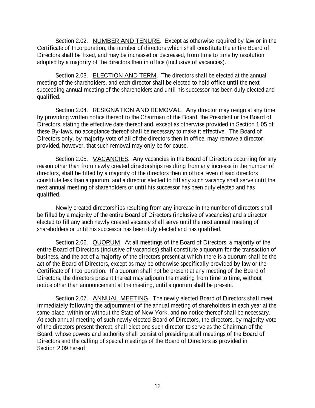12 Section 2.02. NUMBER AND TENURE. Except as otherwise required by law or in the Certificate of Incorporation, the number of directors which shall constitute the entire Board of Directors shall be fixed, and may be increased or decreased, from time to time by resolution adopted by a majority of the directors then in office (inclusive of vacancies). Section 2.03. ELECTION AND TERM. The directors shall be elected at the annual meeting of the shareholders, and each director shall be elected to hold office until the next succeeding annual meeting of the shareholders and until his successor has been duly elected and qualified. Section 2.04. RESIGNATION AND REMOVAL. Any director may resign at any time by providing written notice thereof to the Chairman of the Board, the President or the Board of Directors, stating the effective date thereof and, except as otherwise provided in Section 1.05 of these By-laws, no acceptance thereof shall be necessary to make it effective. The Board of Directors only, by majority vote of all of the directors then in office, may remove a director; provided, however, that such removal may only be for cause. Section 2.05. VACANCIES. Any vacancies in the Board of Directors occurring for any reason other than from newly created directorships resulting from any increase in the number of directors, shall be filled by a majority of the directors then in office, even if said directors constitute less than a quorum, and a director elected to fill any such vacancy shall serve until the next annual meeting of shareholders or until his successor has been duly elected and has qualified. Newly created directorships resulting from any increase in the number of directors shall be filled by a majority of the entire Board of Directors (inclusive of vacancies) and a director elected to fill any such newly created vacancy shall serve until the next annual meeting of shareholders or until his successor has been duly elected and has qualified. Section 2.06. QUORUM. At all meetings of the Board of Directors, a majority of the entire Board of Directors (inclusive of vacancies) shall constitute a quorum for the transaction of business, and the act of a majority of the directors present at which there is a quorum shall be the act of the Board of Directors, except as may be otherwise specifically provided by law or the Certificate of Incorporation. If a quorum shall not be present at any meeting of the Board of Directors, the directors present thereat may adjourn the meeting from time to time, without notice other than announcement at the meeting, until a quorum shall be present. Section 2.07. ANNUAL MEETING. The newly elected Board of Directors shall meet immediately following the adjournment of the annual meeting of shareholders in each year at the same place, within or without the State of New York, and no notice thereof shall be necessary. At each annual meeting of such newly elected Board of Directors, the directors, by majority vote of the directors present thereat, shall elect one such director to serve as the Chairman of the Board, whose powers and authority shall consist of presiding at all meetings of the Board of Directors and the calling of special meetings of the Board of Directors as provided in Section 2.09 hereof.