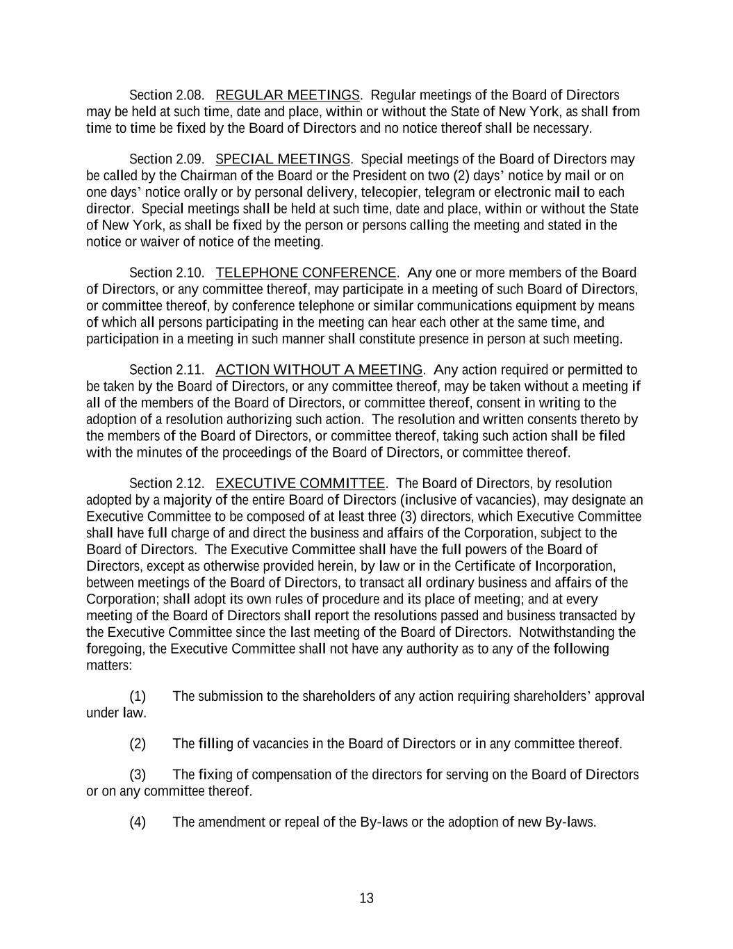 13 Section 2.08. REGULAR MEETINGS. Regular meetings of the Board of Directors may be held at such time, date and place, within or without the State of New York, as shall from time to time be fixed by the Board of Directors and no notice thereof shall be necessary. Section 2.09. SPECIAL MEETINGS. Special meetings of the Board of Directors may be called by the Chairman of the Board or the President on two (2) days’ notice by mail or on one days’ notice orally or by personal delivery, telecopier, telegram or electronic mail to each director. Special meetings shall be held at such time, date and place, within or without the State of New York, as shall be fixed by the person or persons calling the meeting and stated in the notice or waiver of notice of the meeting. Section 2.10. TELEPHONE CONFERENCE. Any one or more members of the Board of Directors, or any committee thereof, may participate in a meeting of such Board of Directors, or committee thereof, by conference telephone or similar communications equipment by means of which all persons participating in the meeting can hear each other at the same time, and participation in a meeting in such manner shall constitute presence in person at such meeting. Section 2.11. ACTION WITHOUT A MEETING. Any action required or permitted to be taken by the Board of Directors, or any committee thereof, may be taken without a meeting if all of the members of the Board of Directors, or committee thereof, consent in writing to the adoption of a resolution authorizing such action. The resolution and written consents thereto by the members of the Board of Directors, or committee thereof, taking such action shall be filed with the minutes of the proceedings of the Board of Directors, or committee thereof. Section 2.12. EXECUTIVE COMMITTEE. The Board of Directors, by resolution adopted by a majority of the entire Board of Directors (inclusive of vacancies), may designate an Executive Committee to be composed of at least three (3) directors, which Executive Committee shall have full charge of and direct the business and affairs of the Corporation, subject to the Board of Directors. The Executive Committee shall have the full powers of the Board of Directors, except as otherwise provided herein, by law or in the Certificate of Incorporation, between meetings of the Board of Directors, to transact all ordinary business and affairs of the Corporation; shall adopt its own rules of procedure and its place of meeting; and at every meeting of the Board of Directors shall report the resolutions passed and business transacted by the Executive Committee since the last meeting of the Board of Directors. Notwithstanding the foregoing, the Executive Committee shall not have any authority as to any of the following matters: (1) The submission to the shareholders of any action requiring shareholders’ approval under law. (2) The filling of vacancies in the Board of Directors or in any committee thereof. (3) The fixing of compensation of the directors for serving on the Board of Directors or on any committee thereof. (4) The amendment or repeal of the By-laws or the adoption of new By-laws.