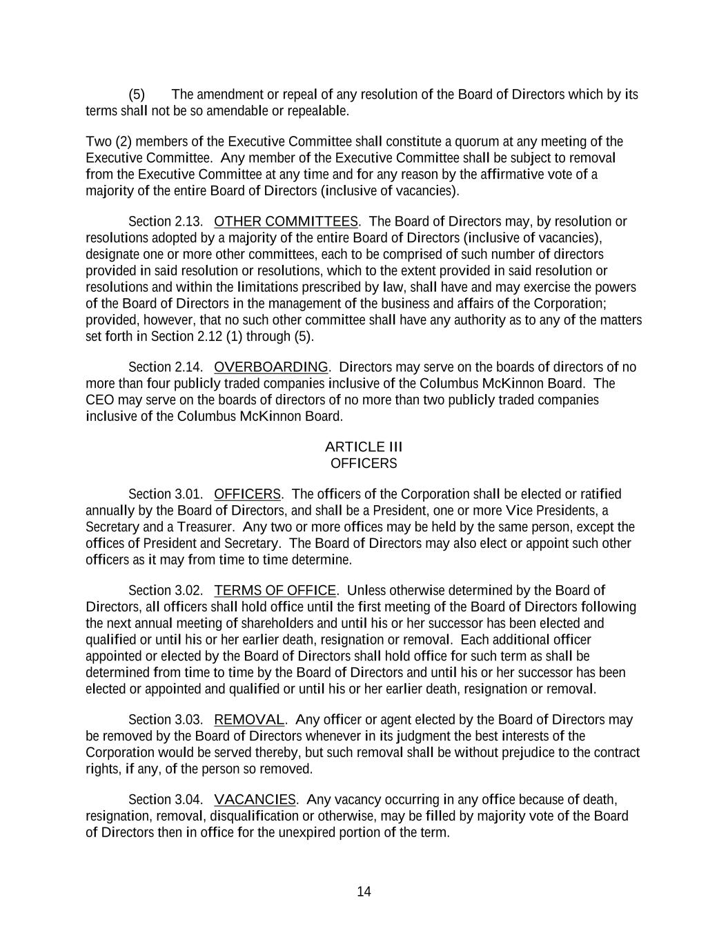 14 (5) The amendment or repeal of any resolution of the Board of Directors which by its terms shall not be so amendable or repealable. Two (2) members of the Executive Committee shall constitute a quorum at any meeting of the Executive Committee. Any member of the Executive Committee shall be subject to removal from the Executive Committee at any time and for any reason by the affirmative vote of a majority of the entire Board of Directors (inclusive of vacancies). Section 2.13. OTHER COMMITTEES. The Board of Directors may, by resolution or resolutions adopted by a majority of the entire Board of Directors (inclusive of vacancies), designate one or more other committees, each to be comprised of such number of directors provided in said resolution or resolutions, which to the extent provided in said resolution or resolutions and within the limitations prescribed by law, shall have and may exercise the powers of the Board of Directors in the management of the business and affairs of the Corporation; provided, however, that no such other committee shall have any authority as to any of the matters set forth in Section 2.12 (1) through (5). Section 2.14. OVERBOARDING. Directors may serve on the boards of directors of no more than four publicly traded companies inclusive of the Columbus McKinnon Board. The CEO may serve on the boards of directors of no more than two publicly traded companies inclusive of the Columbus McKinnon Board. ARTICLE III OFFICERS Section 3.01. OFFICERS. The officers of the Corporation shall be elected or ratified annually by the Board of Directors, and shall be a President, one or more Vice Presidents, a Secretary and a Treasurer. Any two or more offices may be held by the same person, except the offices of President and Secretary. The Board of Directors may also elect or appoint such other officers as it may from time to time determine. Section 3.02. TERMS OF OFFICE. Unless otherwise determined by the Board of Directors, all officers shall hold office until the first meeting of the Board of Directors following the next annual meeting of shareholders and until his or her successor has been elected and qualified or until his or her earlier death, resignation or removal. Each additional officer appointed or elected by the Board of Directors shall hold office for such term as shall be determined from time to time by the Board of Directors and until his or her successor has been elected or appointed and qualified or until his or her earlier death, resignation or removal. Section 3.03. REMOVAL. Any officer or agent elected by the Board of Directors may be removed by the Board of Directors whenever in its judgment the best interests of the Corporation would be served thereby, but such removal shall be without prejudice to the contract rights, if any, of the person so removed. Section 3.04. VACANCIES. Any vacancy occurring in any office because of death, resignation, removal, disqualification or otherwise, may be filled by majority vote of the Board of Directors then in office for the unexpired portion of the term.