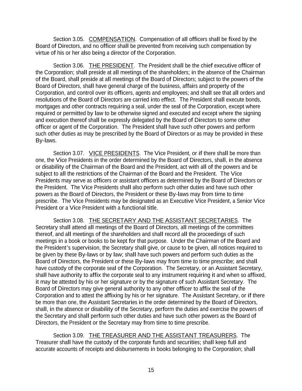 15 Section 3.05. COMPENSATION. Compensation of all officers shall be fixed by the Board of Directors, and no officer shall be prevented from receiving such compensation by virtue of his or her also being a director of the Corporation. Section 3.06. THE PRESIDENT. The President shall be the chief executive officer of the Corporation; shall preside at all meetings of the shareholders; in the absence of the Chairman of the Board, shall preside at all meetings of the Board of Directors; subject to the powers of the Board of Directors, shall have general charge of the business, affairs and property of the Corporation, and control over its officers, agents and employees; and shall see that all orders and resolutions of the Board of Directors are carried into effect. The President shall execute bonds, mortgages and other contracts requiring a seal, under the seal of the Corporation, except where required or permitted by law to be otherwise signed and executed and except where the signing and execution thereof shall be expressly delegated by the Board of Directors to some other officer or agent of the Corporation. The President shall have such other powers and perform such other duties as may be prescribed by the Board of Directors or as may be provided in these By-laws. Section 3.07. VICE PRESIDENTS. The Vice President, or if there shall be more than one, the Vice Presidents in the order determined by the Board of Directors, shall, in the absence or disability of the Chairman of the Board and the President, act with all of the powers and be subject to all the restrictions of the Chairman of the Board and the President. The Vice Presidents may serve as officers or assistant officers as determined by the Board of Directors or the President. The Vice Presidents shall also perform such other duties and have such other powers as the Board of Directors, the President or these By-laws may from time to time prescribe. The Vice Presidents may be designated as an Executive Vice President, a Senior Vice President or a Vice President with a functional title. Section 3.08. THE SECRETARY AND THE ASSISTANT SECRETARIES. The Secretary shall attend all meetings of the Board of Directors, all meetings of the committees thereof, and all meetings of the shareholders and shall record all the proceedings of such meetings in a book or books to be kept for that purpose. Under the Chairman of the Board and the President’s supervision, the Secretary shall give, or cause to be given, all notices required to be given by these By-laws or by law; shall have such powers and perform such duties as the Board of Directors, the President or these By-laws may from time to time prescribe; and shall have custody of the corporate seal of the Corporation. The Secretary, or an Assistant Secretary, shall have authority to affix the corporate seal to any instrument requiring it and when so affixed, it may be attested by his or her signature or by the signature of such Assistant Secretary. The Board of Directors may give general authority to any other officer to affix the seal of the Corporation and to attest the affixing by his or her signature. The Assistant Secretary, or if there be more than one, the Assistant Secretaries in the order determined by the Board of Directors, shall, in the absence or disability of the Secretary, perform the duties and exercise the powers of the Secretary and shall perform such other duties and have such other powers as the Board of Directors, the President or the Secretary may from time to time prescribe. Section 3.09. THE TREASURER AND THE ASSISTANT TREASURERS. The Treasurer shall have the custody of the corporate funds and securities; shall keep full and accurate accounts of receipts and disbursements in books belonging to the Corporation; shall