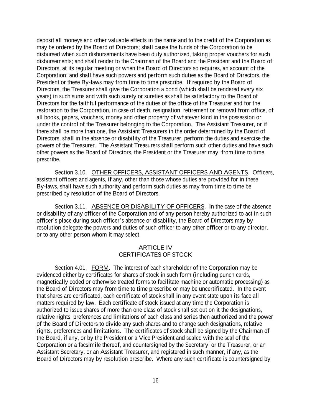 16 deposit all moneys and other valuable effects in the name and to the credit of the Corporation as may be ordered by the Board of Directors; shall cause the funds of the Corporation to be disbursed when such disbursements have been duly authorized, taking proper vouchers for such disbursements; and shall render to the Chairman of the Board and the President and the Board of Directors, at its regular meeting or when the Board of Directors so requires, an account of the Corporation; and shall have such powers and perform such duties as the Board of Directors, the President or these By-laws may from time to time prescribe. If required by the Board of Directors, the Treasurer shall give the Corporation a bond (which shall be rendered every six years) in such sums and with such surety or sureties as shall be satisfactory to the Board of Directors for the faithful performance of the duties of the office of the Treasurer and for the restoration to the Corporation, in case of death, resignation, retirement or removal from office, of all books, papers, vouchers, money and other property of whatever kind in the possession or under the control of the Treasurer belonging to the Corporation. The Assistant Treasurer, or if there shall be more than one, the Assistant Treasurers in the order determined by the Board of Directors, shall in the absence or disability of the Treasurer, perform the duties and exercise the powers of the Treasurer. The Assistant Treasurers shall perform such other duties and have such other powers as the Board of Directors, the President or the Treasurer may, from time to time, prescribe. Section 3.10. OTHER OFFICERS, ASSISTANT OFFICERS AND AGENTS. Officers, assistant officers and agents, if any, other than those whose duties are provided for in these By-laws, shall have such authority and perform such duties as may from time to time be prescribed by resolution of the Board of Directors. Section 3.11. ABSENCE OR DISABILITY OF OFFICERS. In the case of the absence or disability of any officer of the Corporation and of any person hereby authorized to act in such officer’s place during such officer’s absence or disability, the Board of Directors may by resolution delegate the powers and duties of such officer to any other officer or to any director, or to any other person whom it may select. ARTICLE IV CERTIFICATES OF STOCK Section 4.01. FORM. The interest of each shareholder of the Corporation may be evidenced either by certificates for shares of stock in such form (including punch cards, magnetically coded or otherwise treated forms to facilitate machine or automatic processing) as the Board of Directors may from time to time prescribe or may be uncertificated. In the event that shares are certificated, each certificate of stock shall in any event state upon its face all matters required by law. Each certificate of stock issued at any time the Corporation is authorized to issue shares of more than one class of stock shall set out on it the designations, relative rights, preferences and limitations of each class and series then authorized and the power of the Board of Directors to divide any such shares and to change such designations, relative rights, preferences and limitations. The certificates of stock shall be signed by the Chairman of the Board, if any, or by the President or a Vice President and sealed with the seal of the Corporation or a facsimile thereof, and countersigned by the Secretary, or the Treasurer, or an Assistant Secretary, or an Assistant Treasurer, and registered in such manner, if any, as the Board of Directors may by resolution prescribe. Where any such certificate is countersigned by