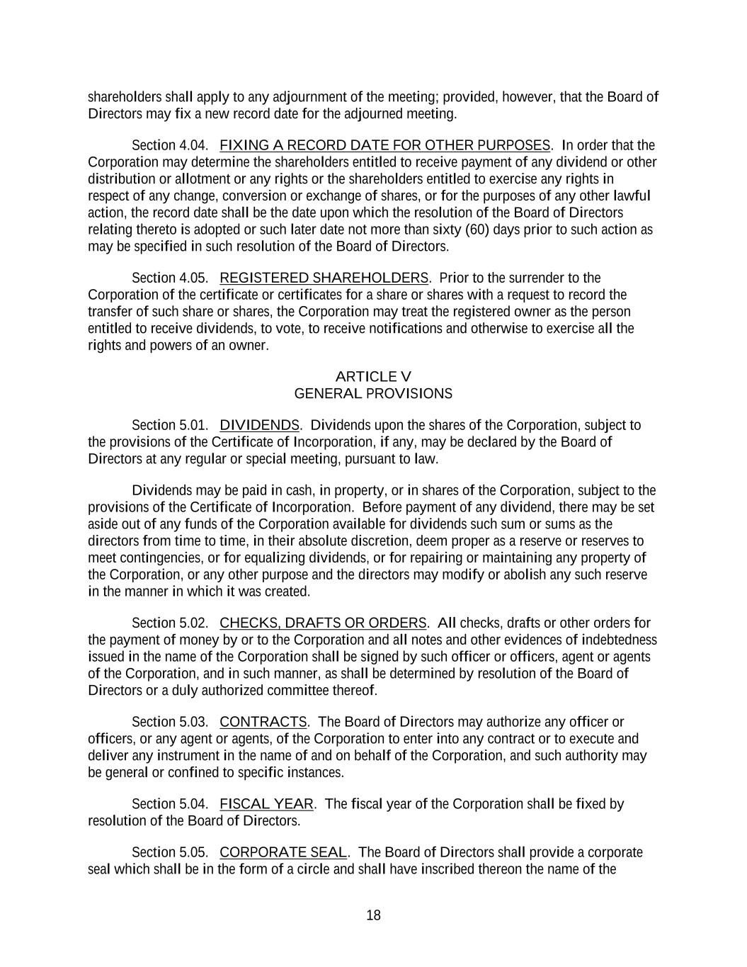 18 shareholders shall apply to any adjournment of the meeting; provided, however, that the Board of Directors may fix a new record date for the adjourned meeting. Section 4.04. FIXING A RECORD DATE FOR OTHER PURPOSES. In order that the Corporation may determine the shareholders entitled to receive payment of any dividend or other distribution or allotment or any rights or the shareholders entitled to exercise any rights in respect of any change, conversion or exchange of shares, or for the purposes of any other lawful action, the record date shall be the date upon which the resolution of the Board of Directors relating thereto is adopted or such later date not more than sixty (60) days prior to such action as may be specified in such resolution of the Board of Directors. Section 4.05. REGISTERED SHAREHOLDERS. Prior to the surrender to the Corporation of the certificate or certificates for a share or shares with a request to record the transfer of such share or shares, the Corporation may treat the registered owner as the person entitled to receive dividends, to vote, to receive notifications and otherwise to exercise all the rights and powers of an owner. ARTICLE V GENERAL PROVISIONS Section 5.01. DIVIDENDS. Dividends upon the shares of the Corporation, subject to the provisions of the Certificate of Incorporation, if any, may be declared by the Board of Directors at any regular or special meeting, pursuant to law. Dividends may be paid in cash, in property, or in shares of the Corporation, subject to the provisions of the Certificate of Incorporation. Before payment of any dividend, there may be set aside out of any funds of the Corporation available for dividends such sum or sums as the directors from time to time, in their absolute discretion, deem proper as a reserve or reserves to meet contingencies, or for equalizing dividends, or for repairing or maintaining any property of the Corporation, or any other purpose and the directors may modify or abolish any such reserve in the manner in which it was created. Section 5.02. CHECKS, DRAFTS OR ORDERS. All checks, drafts or other orders for the payment of money by or to the Corporation and all notes and other evidences of indebtedness issued in the name of the Corporation shall be signed by such officer or officers, agent or agents of the Corporation, and in such manner, as shall be determined by resolution of the Board of Directors or a duly authorized committee thereof. Section 5.03. CONTRACTS. The Board of Directors may authorize any officer or officers, or any agent or agents, of the Corporation to enter into any contract or to execute and deliver any instrument in the name of and on behalf of the Corporation, and such authority may be general or confined to specific instances. Section 5.04. FISCAL YEAR. The fiscal year of the Corporation shall be fixed by resolution of the Board of Directors. Section 5.05. CORPORATE SEAL. The Board of Directors shall provide a corporate seal which shall be in the form of a circle and shall have inscribed thereon the name of the
