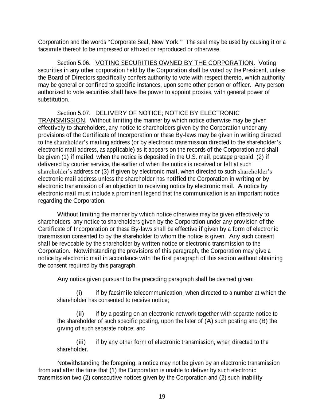 19 Corporation and the words “Corporate Seal, New York.” The seal may be used by causing it or a facsimile thereof to be impressed or affixed or reproduced or otherwise. Section 5.06. VOTING SECURITIES OWNED BY THE CORPORATION. Voting securities in any other corporation held by the Corporation shall be voted by the President, unless the Board of Directors specifically confers authority to vote with respect thereto, which authority may be general or confined to specific instances, upon some other person or officer. Any person authorized to vote securities shall have the power to appoint proxies, with general power of substitution. Section 5.07. DELIVERY OF NOTICE; NOTICE BY ELECTRONIC TRANSMISSION. Without limiting the manner by which notice otherwise may be given effectively to shareholders, any notice to shareholders given by the Corporation under any provisions of the Certificate of Incorporation or these By-laws may be given in writing directed to the shareholder’s mailing address (or by electronic transmission directed to the shareholder’s electronic mail address, as applicable) as it appears on the records of the Corporation and shall be given (1) if mailed, when the notice is deposited in the U.S. mail, postage prepaid, (2) if delivered by courier service, the earlier of when the notice is received or left at such shareholder’s address or (3) if given by electronic mail, when directed to such shareholder’s electronic mail address unless the shareholder has notified the Corporation in writing or by electronic transmission of an objection to receiving notice by electronic mail. A notice by electronic mail must include a prominent legend that the communication is an important notice regarding the Corporation. Without limiting the manner by which notice otherwise may be given effectively to shareholders, any notice to shareholders given by the Corporation under any provision of the Certificate of Incorporation or these By-laws shall be effective if given by a form of electronic transmission consented to by the shareholder to whom the notice is given. Any such consent shall be revocable by the shareholder by written notice or electronic transmission to the Corporation. Notwithstanding the provisions of this paragraph, the Corporation may give a notice by electronic mail in accordance with the first paragraph of this section without obtaining the consent required by this paragraph. Any notice given pursuant to the preceding paragraph shall be deemed given: (i) if by facsimile telecommunication, when directed to a number at which the shareholder has consented to receive notice; (ii) if by a posting on an electronic network together with separate notice to the shareholder of such specific posting, upon the later of (A) such posting and (B) the giving of such separate notice; and (iii) if by any other form of electronic transmission, when directed to the shareholder. Notwithstanding the foregoing, a notice may not be given by an electronic transmission from and after the time that (1) the Corporation is unable to deliver by such electronic transmission two (2) consecutive notices given by the Corporation and (2) such inability