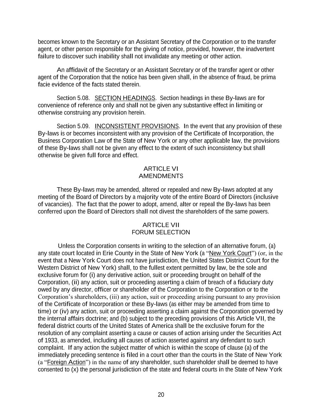 20 becomes known to the Secretary or an Assistant Secretary of the Corporation or to the transfer agent, or other person responsible for the giving of notice, provided, however, the inadvertent failure to discover such inability shall not invalidate any meeting or other action. An affidavit of the Secretary or an Assistant Secretary or of the transfer agent or other agent of the Corporation that the notice has been given shall, in the absence of fraud, be prima facie evidence of the facts stated therein. Section 5.08. SECTION HEADINGS. Section headings in these By-laws are for convenience of reference only and shall not be given any substantive effect in limiting or otherwise construing any provision herein. Section 5.09. INCONSISTENT PROVISIONS. In the event that any provision of these By-laws is or becomes inconsistent with any provision of the Certificate of Incorporation, the Business Corporation Law of the State of New York or any other applicable law, the provisions of these By-laws shall not be given any effect to the extent of such inconsistency but shall otherwise be given full force and effect. ARTICLE VI AMENDMENTS These By-laws may be amended, altered or repealed and new By-laws adopted at any meeting of the Board of Directors by a majority vote of the entire Board of Directors (inclusive of vacancies). The fact that the power to adopt, amend, alter or repeal the By-laws has been conferred upon the Board of Directors shall not divest the shareholders of the same powers. ARTICLE VII FORUM SELECTION Unless the Corporation consents in writing to the selection of an alternative forum, (a) any state court located in Erie County in the State of New York (a “New York Court”) (or, in the event that a New York Court does not have jurisdiction, the United States District Court for the Western District of New York) shall, to the fullest extent permitted by law, be the sole and exclusive forum for (i) any derivative action, suit or proceeding brought on behalf of the Corporation, (ii) any action, suit or proceeding asserting a claim of breach of a fiduciary duty owed by any director, officer or shareholder of the Corporation to the Corporation or to the Corporation’s shareholders, (iii) any action, suit or proceeding arising pursuant to any provision of the Certificate of Incorporation or these By-laws (as either may be amended from time to time) or (iv) any action, suit or proceeding asserting a claim against the Corporation governed by the internal affairs doctrine; and (b) subject to the preceding provisions of this Article VII, the federal district courts of the United States of America shall be the exclusive forum for the resolution of any complaint asserting a cause or causes of action arising under the Securities Act of 1933, as amended, including all causes of action asserted against any defendant to such complaint. If any action the subject matter of which is within the scope of clause (a) of the immediately preceding sentence is filed in a court other than the courts in the State of New York (a “Foreign Action”) in the name of any shareholder, such shareholder shall be deemed to have consented to (x) the personal jurisdiction of the state and federal courts in the State of New York