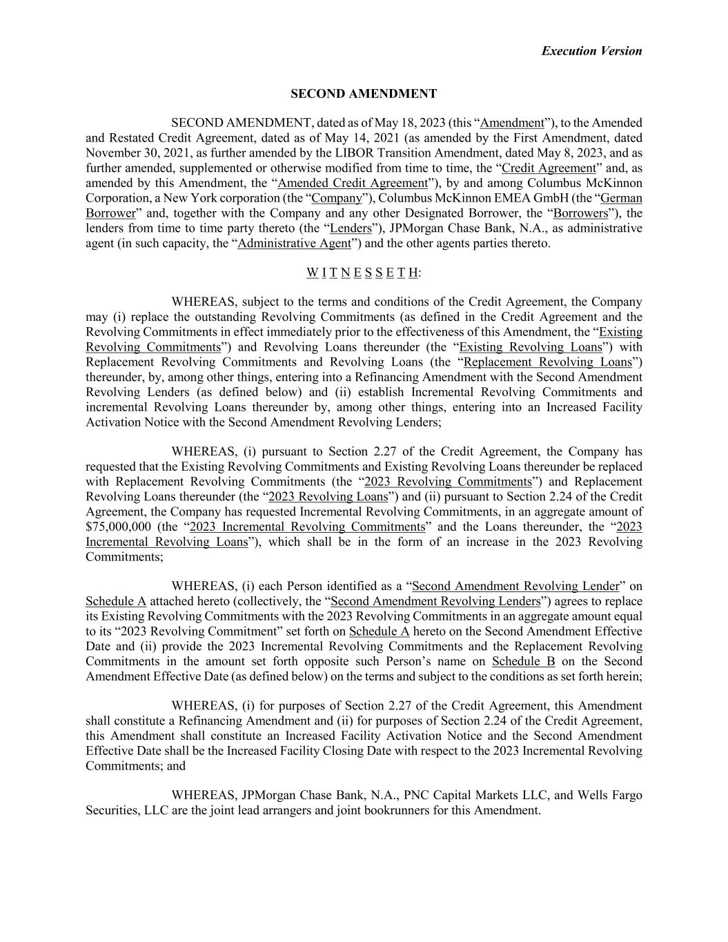Execution Version SECOND AMENDMENT SECOND AMENDMENT, dated as of May 18, 2023 (this “Amendment”), to the Amended and Restated Credit Agreement, dated as of May 14, 2021 (as amended by the First Amendment, dated November 30, 2021, as further amended by the LIBOR Transition Amendment, dated May 8, 2023, and as further amended, supplemented or otherwise modified from time to time, the “Credit Agreement” and, as amended by this Amendment, the “Amended Credit Agreement”), by and among Columbus McKinnon Corporation, a New York corporation (the “Company”), Columbus McKinnon EMEA GmbH (the “German Borrower” and, together with the Company and any other Designated Borrower, the “Borrowers”), the lenders from time to time party thereto (the “Lenders”), JPMorgan Chase Bank, N.A., as administrative agent (in such capacity, the “Administrative Agent”) and the other agents parties thereto. W I T N E S S E T H: WHEREAS, subject to the terms and conditions of the Credit Agreement, the Company may (i) replace the outstanding Revolving Commitments (as defined in the Credit Agreement and the Revolving Commitments in effect immediately prior to the effectiveness of this Amendment, the “Existing Revolving Commitments”) and Revolving Loans thereunder (the “Existing Revolving Loans”) with Replacement Revolving Commitments and Revolving Loans (the “Replacement Revolving Loans”) thereunder, by, among other things, entering into a Refinancing Amendment with the Second Amendment Revolving Lenders (as defined below) and (ii) establish Incremental Revolving Commitments and incremental Revolving Loans thereunder by, among other things, entering into an Increased Facility Activation Notice with the Second Amendment Revolving Lenders; WHEREAS, (i) pursuant to Section 2.27 of the Credit Agreement, the Company has requested that the Existing Revolving Commitments and Existing Revolving Loans thereunder be replaced with Replacement Revolving Commitments (the “2023 Revolving Commitments”) and Replacement Revolving Loans thereunder (the “2023 Revolving Loans”) and (ii) pursuant to Section 2.24 of the Credit Agreement, the Company has requested Incremental Revolving Commitments, in an aggregate amount of $75,000,000 (the “2023 Incremental Revolving Commitments” and the Loans thereunder, the “2023 Incremental Revolving Loans”), which shall be in the form of an increase in the 2023 Revolving Commitments; WHEREAS, (i) each Person identified as a “Second Amendment Revolving Lender” on Schedule A attached hereto (collectively, the “Second Amendment Revolving Lenders”) agrees to replace its Existing Revolving Commitments with the 2023 Revolving Commitments in an aggregate amount equal to its “2023 Revolving Commitment” set forth on Schedule A hereto on the Second Amendment Effective Date and (ii) provide the 2023 Incremental Revolving Commitments and the Replacement Revolving Commitments in the amount set forth opposite such Person’s name on Schedule B on the Second Amendment Effective Date (as defined below) on the terms and subject to the conditions as set forth herein; WHEREAS, (i) for purposes of Section 2.27 of the Credit Agreement, this Amendment shall constitute a Refinancing Amendment and (ii) for purposes of Section 2.24 of the Credit Agreement, this Amendment shall constitute an Increased Facility Activation Notice and the Second Amendment Effective Date shall be the Increased Facility Closing Date with respect to the 2023 Incremental Revolving Commitments; and WHEREAS, JPMorgan Chase Bank, N.A., PNC Capital Markets LLC, and Wells Fargo Securities, LLC are the joint lead arrangers and joint bookrunners for this Amendment.
