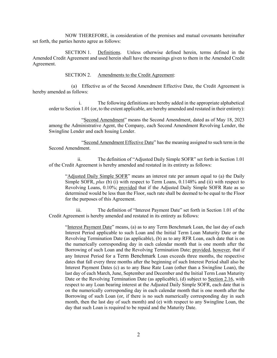 2 NOW THEREFORE, in consideration of the premises and mutual covenants hereinafter set forth, the parties hereto agree as follows: SECTION 1. Definitions. Unless otherwise defined herein, terms defined in the Amended Credit Agreement and used herein shall have the meanings given to them in the Amended Credit Agreement. SECTION 2. Amendments to the Credit Agreement: (a) Effective as of the Second Amendment Effective Date, the Credit Agreement is hereby amended as follows: i. The following definitions are hereby added in the appropriate alphabetical order to Section 1.01 (or, to the extent applicable, are hereby amended and restated in their entirety): “Second Amendment” means the Second Amendment, dated as of May 18, 2023 among the Administrative Agent, the Company, each Second Amendment Revolving Lender, the Swingline Lender and each Issuing Lender. “Second Amendment Effective Date” has the meaning assigned to such term in the Second Amendment. ii. The definition of “Adjusted Daily Simple SOFR” set forth in Section 1.01 of the Credit Agreement is hereby amended and restated in its entirety as follows: “Adjusted Daily Simple SOFR” means an interest rate per annum equal to (a) the Daily Simple SOFR, plus (b) (i) with respect to Term Loans, 0.1148% and (ii) with respect to Revolving Loans, 0.10%; provided that if the Adjusted Daily Simple SOFR Rate as so determined would be less than the Floor, such rate shall be deemed to be equal to the Floor for the purposes of this Agreement. iii. The definition of “Interest Payment Date” set forth in Section 1.01 of the Credit Agreement is hereby amended and restated in its entirety as follows: “Interest Payment Date” means, (a) as to any Term Benchmark Loan, the last day of each Interest Period applicable to such Loan and the Initial Term Loan Maturity Date or the Revolving Termination Date (as applicable), (b) as to any RFR Loan, each date that is on the numerically corresponding day in each calendar month that is one month after the Borrowing of such Loan and the Revolving Termination Date; provided, however, that if any Interest Period for a Term Benchmark Loan exceeds three months, the respective dates that fall every three months after the beginning of such Interest Period shall also be Interest Payment Dates (c) as to any Base Rate Loan (other than a Swingline Loan), the last day of each March, June, September and December and the Initial Term Loan Maturity Date or the Revolving Termination Date (as applicable), (d) subject to Section 2.16, with respect to any Loan bearing interest at the Adjusted Daily Simple SOFR, each date that is on the numerically corresponding day in each calendar month that is one month after the Borrowing of such Loan (or, if there is no such numerically corresponding day in such month, then the last day of such month) and (e) with respect to any Swingline Loan, the day that such Loan is required to be repaid and the Maturity Date.