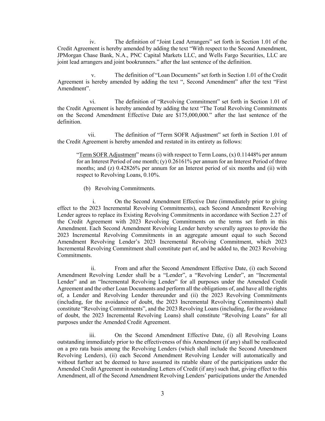 3 iv. The definition of “Joint Lead Arrangers” set forth in Section 1.01 of the Credit Agreement is hereby amended by adding the text “With respect to the Second Amendment, JPMorgan Chase Bank, N.A., PNC Capital Markets LLC, and Wells Fargo Securities, LLC are joint lead arrangers and joint bookrunners.” after the last sentence of the definition. v. The definition of “Loan Documents” set forth in Section 1.01 of the Credit Agreement is hereby amended by adding the text “, Second Amendment” after the text “First Amendment”. vi. The definition of “Revolving Commitment” set forth in Section 1.01 of the Credit Agreement is hereby amended by adding the text “The Total Revolving Commitments on the Second Amendment Effective Date are $175,000,000.” after the last sentence of the definition. vii. The definition of “Term SOFR Adjustment” set forth in Section 1.01 of the Credit Agreement is hereby amended and restated in its entirety as follows: “Term SOFR Adjustment” means (i) with respect to Term Loans, (x) 0.11448% per annum for an Interest Period of one month; (y) 0.26161% per annum for an Interest Period of three months; and (z) 0.42826% per annum for an Interest period of six months and (ii) with respect to Revolving Loans, 0.10%. (b) Revolving Commitments. i. On the Second Amendment Effective Date (immediately prior to giving effect to the 2023 Incremental Revolving Commitments), each Second Amendment Revolving Lender agrees to replace its Existing Revolving Commitments in accordance with Section 2.27 of the Credit Agreement with 2023 Revolving Commitments on the terms set forth in this Amendment. Each Second Amendment Revolving Lender hereby severally agrees to provide the 2023 Incremental Revolving Commitments in an aggregate amount equal to such Second Amendment Revolving Lender’s 2023 Incremental Revolving Commitment, which 2023 Incremental Revolving Commitment shall constitute part of, and be added to, the 2023 Revolving Commitments. ii. From and after the Second Amendment Effective Date, (i) each Second Amendment Revolving Lender shall be a “Lender”, a “Revolving Lender”, an “Incremental Lender” and an “Incremental Revolving Lender” for all purposes under the Amended Credit Agreement and the other Loan Documents and perform all the obligations of, and have all the rights of, a Lender and Revolving Lender thereunder and (ii) the 2023 Revolving Commitments (including, for the avoidance of doubt, the 2023 Incremental Revolving Commitments) shall constitute “Revolving Commitments”, and the 2023 Revolving Loans (including, for the avoidance of doubt, the 2023 Incremental Revolving Loans) shall constitute “Revolving Loans” for all purposes under the Amended Credit Agreement. iii. On the Second Amendment Effective Date, (i) all Revolving Loans outstanding immediately prior to the effectiveness of this Amendment (if any) shall be reallocated on a pro rata basis among the Revolving Lenders (which shall include the Second Amendment Revolving Lenders), (ii) each Second Amendment Revolving Lender will automatically and without further act be deemed to have assumed its ratable share of the participations under the Amended Credit Agreement in outstanding Letters of Credit (if any) such that, giving effect to this Amendment, all of the Second Amendment Revolving Lenders’ participations under the Amended