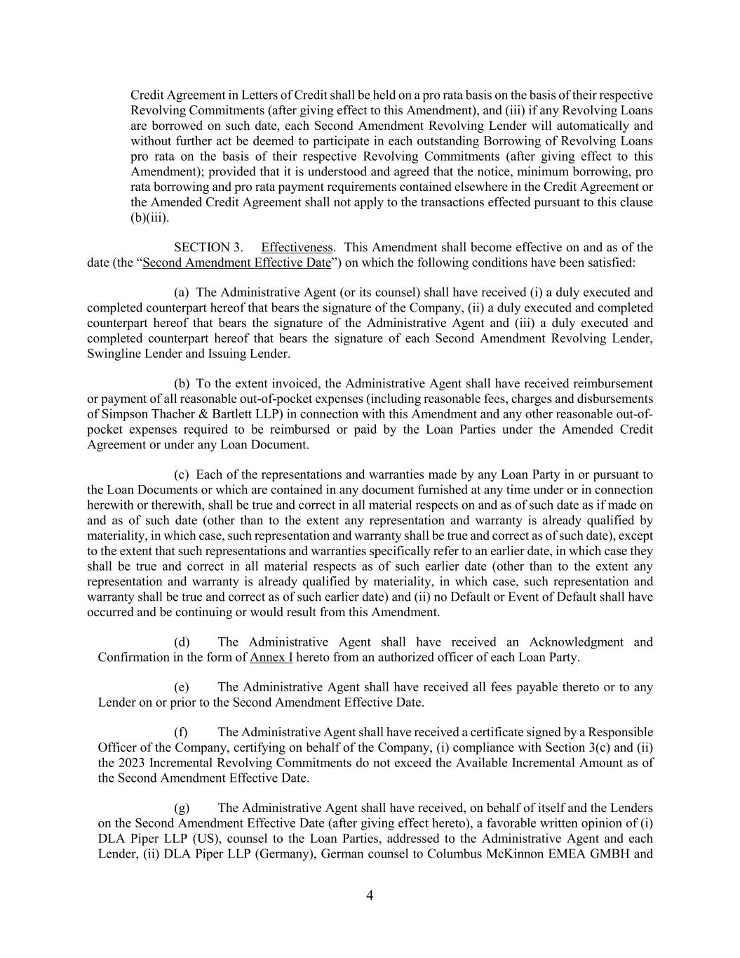 4 Credit Agreement in Letters of Credit shall be held on a pro rata basis on the basis of their respective Revolving Commitments (after giving effect to this Amendment), and (iii) if any Revolving Loans are borrowed on such date, each Second Amendment Revolving Lender will automatically and without further act be deemed to participate in each outstanding Borrowing of Revolving Loans pro rata on the basis of their respective Revolving Commitments (after giving effect to this Amendment); provided that it is understood and agreed that the notice, minimum borrowing, pro rata borrowing and pro rata payment requirements contained elsewhere in the Credit Agreement or the Amended Credit Agreement shall not apply to the transactions effected pursuant to this clause (b)(iii). SECTION 3. Effectiveness. This Amendment shall become effective on and as of the date (the “Second Amendment Effective Date”) on which the following conditions have been satisfied: (a) The Administrative Agent (or its counsel) shall have received (i) a duly executed and completed counterpart hereof that bears the signature of the Company, (ii) a duly executed and completed counterpart hereof that bears the signature of the Administrative Agent and (iii) a duly executed and completed counterpart hereof that bears the signature of each Second Amendment Revolving Lender, Swingline Lender and Issuing Lender. (b) To the extent invoiced, the Administrative Agent shall have received reimbursement or payment of all reasonable out-of-pocket expenses (including reasonable fees, charges and disbursements of Simpson Thacher & Bartlett LLP) in connection with this Amendment and any other reasonable out-of- pocket expenses required to be reimbursed or paid by the Loan Parties under the Amended Credit Agreement or under any Loan Document. (c) Each of the representations and warranties made by any Loan Party in or pursuant to the Loan Documents or which are contained in any document furnished at any time under or in connection herewith or therewith, shall be true and correct in all material respects on and as of such date as if made on and as of such date (other than to the extent any representation and warranty is already qualified by materiality, in which case, such representation and warranty shall be true and correct as of such date), except to the extent that such representations and warranties specifically refer to an earlier date, in which case they shall be true and correct in all material respects as of such earlier date (other than to the extent any representation and warranty is already qualified by materiality, in which case, such representation and warranty shall be true and correct as of such earlier date) and (ii) no Default or Event of Default shall have occurred and be continuing or would result from this Amendment. (d) The Administrative Agent shall have received an Acknowledgment and Confirmation in the form of Annex I hereto from an authorized officer of each Loan Party. (e) The Administrative Agent shall have received all fees payable thereto or to any Lender on or prior to the Second Amendment Effective Date. (f) The Administrative Agent shall have received a certificate signed by a Responsible Officer of the Company, certifying on behalf of the Company, (i) compliance with Section 3(c) and (ii) the 2023 Incremental Revolving Commitments do not exceed the Available Incremental Amount as of the Second Amendment Effective Date. (g) The Administrative Agent shall have received, on behalf of itself and the Lenders on the Second Amendment Effective Date (after giving effect hereto), a favorable written opinion of (i) DLA Piper LLP (US), counsel to the Loan Parties, addressed to the Administrative Agent and each Lender, (ii) DLA Piper LLP (Germany), German counsel to Columbus McKinnon EMEA GMBH and