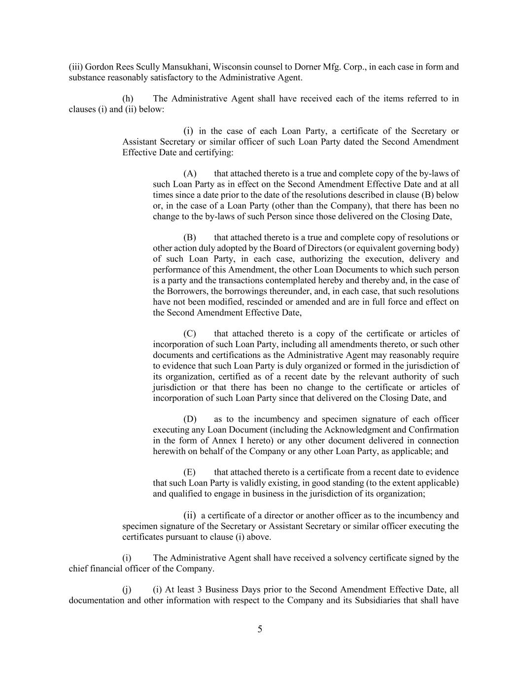 5 (iii) Gordon Rees Scully Mansukhani, Wisconsin counsel to Dorner Mfg. Corp., in each case in form and substance reasonably satisfactory to the Administrative Agent. (h) The Administrative Agent shall have received each of the items referred to in clauses (i) and (ii) below: (i) in the case of each Loan Party, a certificate of the Secretary or Assistant Secretary or similar officer of such Loan Party dated the Second Amendment Effective Date and certifying: (A) that attached thereto is a true and complete copy of the by-laws of such Loan Party as in effect on the Second Amendment Effective Date and at all times since a date prior to the date of the resolutions described in clause (B) below or, in the case of a Loan Party (other than the Company), that there has been no change to the by-laws of such Person since those delivered on the Closing Date, (B) that attached thereto is a true and complete copy of resolutions or other action duly adopted by the Board of Directors (or equivalent governing body) of such Loan Party, in each case, authorizing the execution, delivery and performance of this Amendment, the other Loan Documents to which such person is a party and the transactions contemplated hereby and thereby and, in the case of the Borrowers, the borrowings thereunder, and, in each case, that such resolutions have not been modified, rescinded or amended and are in full force and effect on the Second Amendment Effective Date, (C) that attached thereto is a copy of the certificate or articles of incorporation of such Loan Party, including all amendments thereto, or such other documents and certifications as the Administrative Agent may reasonably require to evidence that such Loan Party is duly organized or formed in the jurisdiction of its organization, certified as of a recent date by the relevant authority of such jurisdiction or that there has been no change to the certificate or articles of incorporation of such Loan Party since that delivered on the Closing Date, and (D) as to the incumbency and specimen signature of each officer executing any Loan Document (including the Acknowledgment and Confirmation in the form of Annex I hereto) or any other document delivered in connection herewith on behalf of the Company or any other Loan Party, as applicable; and (E) that attached thereto is a certificate from a recent date to evidence that such Loan Party is validly existing, in good standing (to the extent applicable) and qualified to engage in business in the jurisdiction of its organization; (ii) a certificate of a director or another officer as to the incumbency and specimen signature of the Secretary or Assistant Secretary or similar officer executing the certificates pursuant to clause (i) above. (i) The Administrative Agent shall have received a solvency certificate signed by the chief financial officer of the Company. (j) (i) At least 3 Business Days prior to the Second Amendment Effective Date, all documentation and other information with respect to the Company and its Subsidiaries that shall have