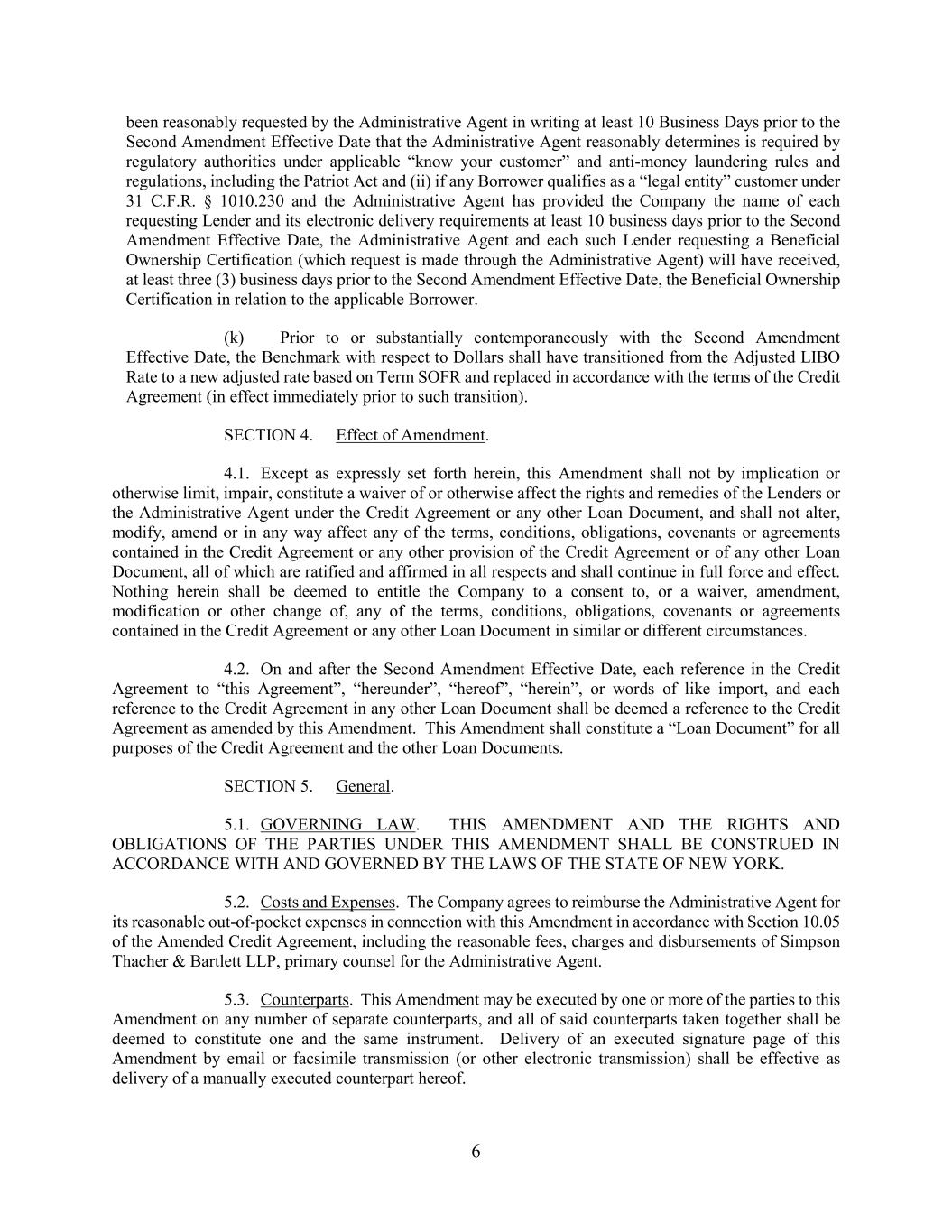 6 been reasonably requested by the Administrative Agent in writing at least 10 Business Days prior to the Second Amendment Effective Date that the Administrative Agent reasonably determines is required by regulatory authorities under applicable “know your customer” and anti-money laundering rules and regulations, including the Patriot Act and (ii) if any Borrower qualifies as a “legal entity” customer under 31 C.F.R. § 1010.230 and the Administrative Agent has provided the Company the name of each requesting Lender and its electronic delivery requirements at least 10 business days prior to the Second Amendment Effective Date, the Administrative Agent and each such Lender requesting a Beneficial Ownership Certification (which request is made through the Administrative Agent) will have received, at least three (3) business days prior to the Second Amendment Effective Date, the Beneficial Ownership Certification in relation to the applicable Borrower. (k) Prior to or substantially contemporaneously with the Second Amendment Effective Date, the Benchmark with respect to Dollars shall have transitioned from the Adjusted LIBO Rate to a new adjusted rate based on Term SOFR and replaced in accordance with the terms of the Credit Agreement (in effect immediately prior to such transition). SECTION 4. Effect of Amendment. 4.1. Except as expressly set forth herein, this Amendment shall not by implication or otherwise limit, impair, constitute a waiver of or otherwise affect the rights and remedies of the Lenders or the Administrative Agent under the Credit Agreement or any other Loan Document, and shall not alter, modify, amend or in any way affect any of the terms, conditions, obligations, covenants or agreements contained in the Credit Agreement or any other provision of the Credit Agreement or of any other Loan Document, all of which are ratified and affirmed in all respects and shall continue in full force and effect. Nothing herein shall be deemed to entitle the Company to a consent to, or a waiver, amendment, modification or other change of, any of the terms, conditions, obligations, covenants or agreements contained in the Credit Agreement or any other Loan Document in similar or different circumstances. 4.2. On and after the Second Amendment Effective Date, each reference in the Credit Agreement to “this Agreement”, “hereunder”, “hereof”, “herein”, or words of like import, and each reference to the Credit Agreement in any other Loan Document shall be deemed a reference to the Credit Agreement as amended by this Amendment. This Amendment shall constitute a “Loan Document” for all purposes of the Credit Agreement and the other Loan Documents. SECTION 5. General. 5.1. GOVERNING LAW. THIS AMENDMENT AND THE RIGHTS AND OBLIGATIONS OF THE PARTIES UNDER THIS AMENDMENT SHALL BE CONSTRUED IN ACCORDANCE WITH AND GOVERNED BY THE LAWS OF THE STATE OF NEW YORK. 5.2. Costs and Expenses. The Company agrees to reimburse the Administrative Agent for its reasonable out-of-pocket expenses in connection with this Amendment in accordance with Section 10.05 of the Amended Credit Agreement, including the reasonable fees, charges and disbursements of Simpson Thacher & Bartlett LLP, primary counsel for the Administrative Agent. 5.3. Counterparts. This Amendment may be executed by one or more of the parties to this Amendment on any number of separate counterparts, and all of said counterparts taken together shall be deemed to constitute one and the same instrument. Delivery of an executed signature page of this Amendment by email or facsimile transmission (or other electronic transmission) shall be effective as delivery of a manually executed counterpart hereof.