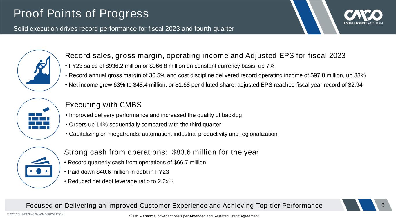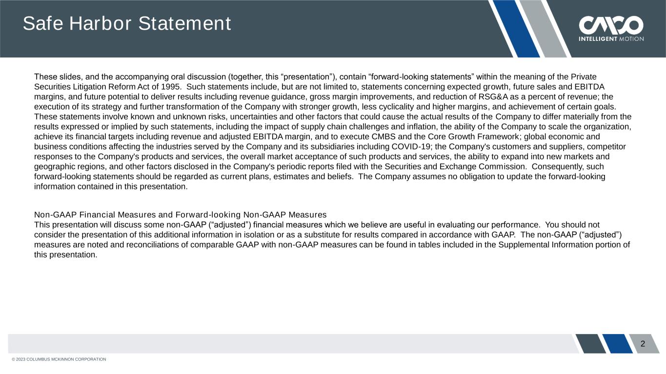 © 2023 COLUMBUS MCKINNON CORPORATION These slides, and the accompanying oral discussion (together, this “presentation”), contain “forward-looking statements” within the meaning of the Private Securities Litigation Reform Act of 1995. Such statements include, but are not limited to, statements concerning expected growth, future sales and EBITDA margins, and future potential to deliver results including revenue guidance, gross margin improvements, and reduction of RSG&A as a percent of revenue; the execution of its strategy and further transformation of the Company with stronger growth, less cyclicality and higher margins, and achievement of certain goals. These statements involve known and unknown risks, uncertainties and other factors that could cause the actual results of the Company to differ materially from the results expressed or implied by such statements, including the impact of supply chain challenges and inflation, the ability of the Company to scale the organization, achieve its financial targets including revenue and adjusted EBITDA margin, and to execute CMBS and the Core Growth Framework; global economic and business conditions affecting the industries served by the Company and its subsidiaries including COVID-19; the Company's customers and suppliers, competitor responses to the Company's products and services, the overall market acceptance of such products and services, the ability to expand into new markets and geographic regions, and other factors disclosed in the Company's periodic reports filed with the Securities and Exchange Commission. Consequently, such forward-looking statements should be regarded as current plans, estimates and beliefs. The Company assumes no obligation to update the forward-looking information contained in this presentation. Non-GAAP Financial Measures and Forward-looking Non-GAAP Measures This presentation will discuss some non-GAAP (“adjusted”) financial measures which we believe are useful in evaluating our performance. You should not consider the presentation of this additional information in isolation or as a substitute for results compared in accordance with GAAP. The non-GAAP (“adjusted”) measures are noted and reconciliations of comparable GAAP with non-GAAP measures can be found in tables included in the Supplemental Information portion of this presentation. Safe Harbor Statement 2