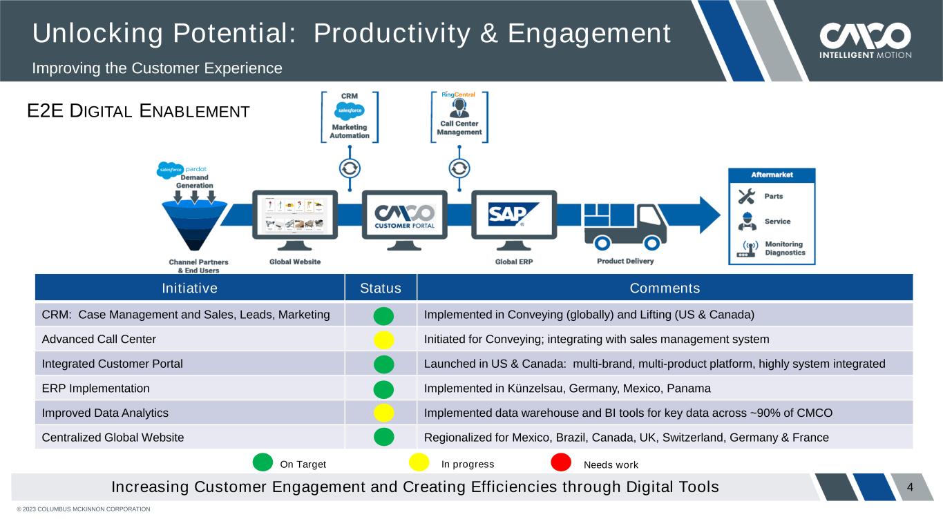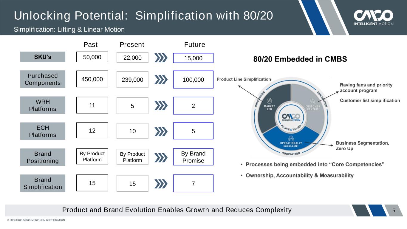 © 2023 COLUMBUS MCKINNON CORPORATION Increasing Customer Engagement and Creating Efficiencies through Digital Tools Unlocking Potential: Productivity & Engagement 4 E2E DIGITAL ENABLEMENT Initiative Status Comments CRM: Case Management and Sales, Leads, Marketing Implemented in Conveying (globally) and Lifting (US & Canada) Advanced Call Center Initiated for Conveying; integrating with sales management system Integrated Customer Portal Launched in US & Canada: multi-brand, multi-product platform, highly system integrated ERP Implementation Implemented in Künzelsau, Germany, Mexico, Panama Improved Data Analytics Implemented data warehouse and BI tools for key data across ~90% of CMCO Centralized Global Website Regionalized for Mexico, Brazil, Canada, UK, Switzerland, Germany & France On Target In progress Needs work Improving the Customer Experience