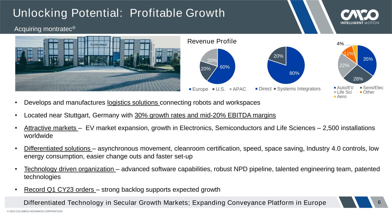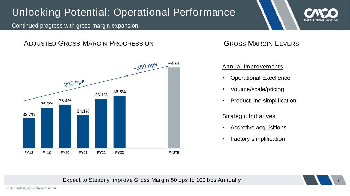 © 2023 COLUMBUS MCKINNON CORPORATION 6 Unlocking Potential: Profitable Growth Acquiring montratec® Differentiated Technology in Secular Growth Markets; Expanding Conveyance Platform in Europe Revenue Profile • Develops and manufactures logistics solutions connecting robots and workspaces • Located near Stuttgart, Germany with 30% growth rates and mid-20% EBITDA margins • Attractive markets – EV market expansion, growth in Electronics, Semiconductors and Life Sciences – 2,500 installations worldwide • Differentiated solutions – asynchronous movement, cleanroom certification, speed, space saving, Industry 4.0 controls, low energy consumption, easier change outs and faster set-up • Technology driven organization – advanced software capabilities, robust NPD pipeline, talented engineering team, patented technologies • Record Q1 CY23 orders – strong backlog supports expected growth 60%20% 20% Europe U.S. APAC 80% 20% Direct Systems Integrators 35% 28% 22% 11% 4% Auto/EV Semi/Elec Life Sci Other Aero
