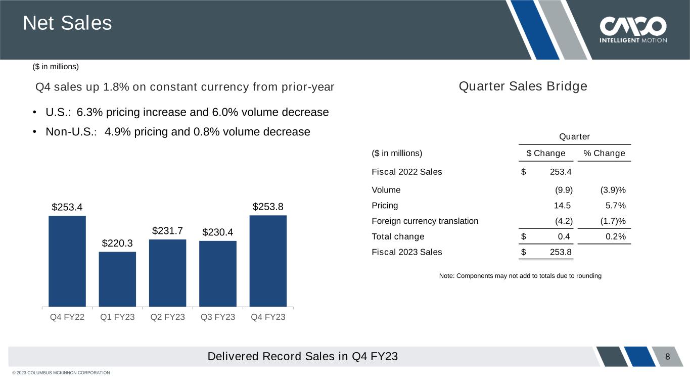 © 2023 COLUMBUS MCKINNON CORPORATION 3 Proof Points of Progress Solid execution drives record performance for fiscal 2023 and fourth quarter Record sales, gross margin, operating income and Adjusted EPS for fiscal 2023 • FY23 sales of $936.2 million or $966.8 million on constant currency basis, up 7% • Record annual gross margin of 36.5% and cost discipline delivered record operating income of $97.8 million, up 33% • Net income grew 63% to $48.4 million, or $1.68 per diluted share; adjusted EPS reached fiscal year record of $2.94 Executing with CMBS • Improved delivery performance and increased the quality of backlog • Orders up 14% sequentially compared with the third quarter • Capitalizing on megatrends: automation, industrial productivity and regionalization Focused on Delivering an Improved Customer Experience and Achieving Top-tier Performance Strong cash from operations: $83.6 million for the year • Record quarterly cash from operations of $66.7 million • Paid down $40.6 million in debt in FY23 • Reduced net debt leverage ratio to 2.2x(1) (1) On A financial covenant basis per Amended and Restated Credit Agreement