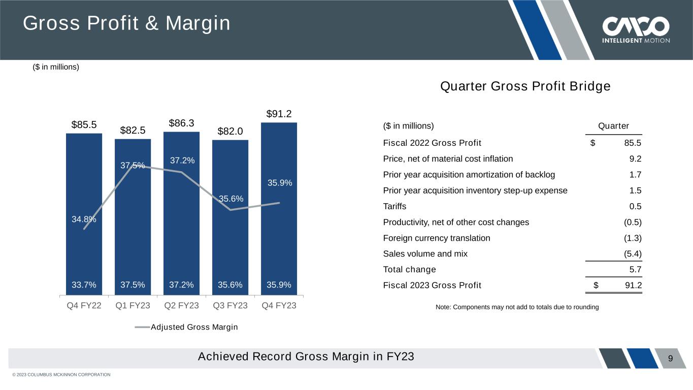 © 2023 COLUMBUS MCKINNON CORPORATION Net Sales Delivered Record Sales in Q4 FY23 Quarter Sales Bridge • U.S.: 6.3% pricing increase and 6.0% volume decrease • Non-U.S.: 4.9% pricing and 0.8% volume decrease 8 Q4 sales up 1.8% on constant currency from prior-year $253.4 $220.3 $231.7 $230.4 $253.8 Q4 FY22 Q1 FY23 Q2 FY23 Q3 FY23 Q4 FY23 ($ in millions) Note: Components may not add to totals due to rounding Quarter ($ in millions) $ Change % Change Fiscal 2022 Sales $ 253.4 Volume (9.9) (3.9)% Pricing 14.5 5.7% Foreign currency translation (4.2) (1.7)% Total change $ 0.4 0.2% Fiscal 2023 Sales $ 253.8