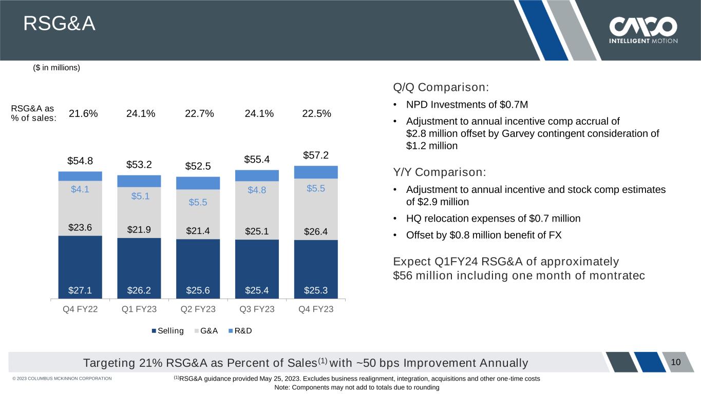 © 2023 COLUMBUS MCKINNON CORPORATION 9 Gross Profit & Margin Quarter Gross Profit Bridge Achieved Record Gross Margin in FY23 $85.5 $82.5 $86.3 $82.0 $91.2 33.7% 37.5% 37.2% 35.6% 35.9% 34.8% 37.5% 37.2% 35.6% 35.9% Q4 FY22 Q1 FY23 Q2 FY23 Q3 FY23 Q4 FY23 Adjusted Gross Margin ($ in millions) Note: Components may not add to totals due to rounding ($ in millions) Quarter Fiscal 2022 Gross Profit $ 85.5 Price, net of material cost inflation 9.2 Prior year acquisition amortization of backlog 1.7 Prior year acquisition inventory step-up expense 1.5 Tariffs 0.5 Productivity, net of other cost changes (0.5) Foreign currency translation (1.3) Sales volume and mix (5.4) Total change 5.7 Fiscal 2023 Gross Profit $ 91.2