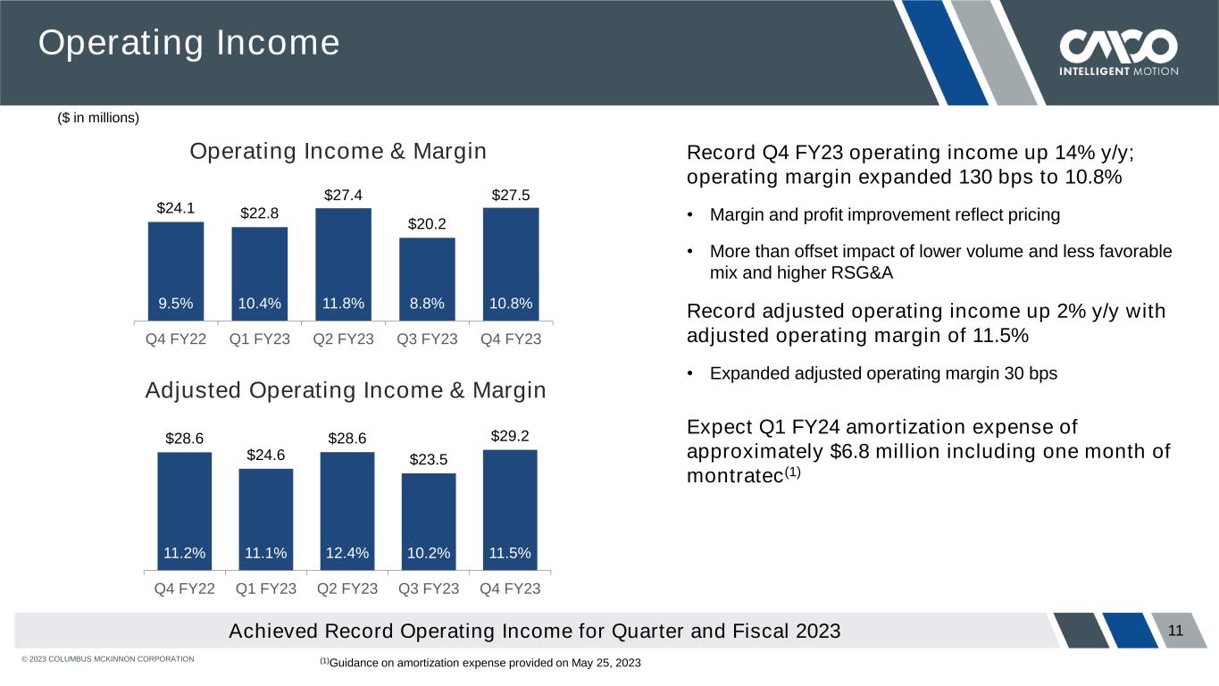 © 2023 COLUMBUS MCKINNON CORPORATION 10 RSG&A $27.1 $26.2 $25.6 $25.4 $25.3 $23.6 $21.9 $21.4 $25.1 $26.4 $4.1 $5.1 $5.5 $4.8 $5.5 $54.8 $53.2 $52.5 $55.4 $57.2 Q4 FY22 Q1 FY23 Q2 FY23 Q3 FY23 Q4 FY23 Selling G&A R&D Q/Q Comparison: • NPD Investments of $0.7M • Adjustment to annual incentive comp accrual of $2.8 million offset by Garvey contingent consideration of $1.2 million Y/Y Comparison: • Adjustment to annual incentive and stock comp estimates of $2.9 million • HQ relocation expenses of $0.7 million • Offset by $0.8 million benefit of FX Expect Q1FY24 RSG&A of approximately $56 million including one month of montratec (1)RSG&A guidance provided May 25, 2023. Excludes business realignment, integration, acquisitions and other one-time costs Note: Components may not add to totals due to rounding RSG&A as % of sales: 22.5% Targeting 21% RSG&A as Percent of Sales(1) with ~50 bps Improvement Annually ($ in millions) 21.6% 22.7% 24.1%24.1%