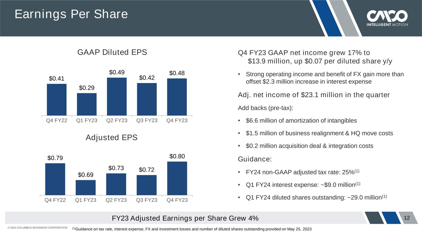 © 2023 COLUMBUS MCKINNON CORPORATION 11 Operating Income Record Q4 FY23 operating income up 14% y/y; operating margin expanded 130 bps to 10.8% • Margin and profit improvement reflect pricing • More than offset impact of lower volume and less favorable mix and higher RSG&A Record adjusted operating income up 2% y/y with adjusted operating margin of 11.5% • Expanded adjusted operating margin 30 bps Expect Q1 FY24 amortization expense of approximately $6.8 million including one month of montratec(1) Achieved Record Operating Income for Quarter and Fiscal 2023 Operating Income & Margin Adjusted Operating Income & Margin $28.6 $24.6 $28.6 $23.5 $29.2 11.2% 11.1% 12.4% 10.2% 11.5% Q4 FY22 Q1 FY23 Q2 FY23 Q3 FY23 Q4 FY23 $24.1 $22.8 $27.4 $20.2 $27.5 9.5% 10.4% 11.8% 8.8% 10.8% Q4 FY22 Q1 FY23 Q2 FY23 Q3 FY23 Q4 FY23 ($ in millions) (1)Guidance on amortization expense provided on May 25, 2023