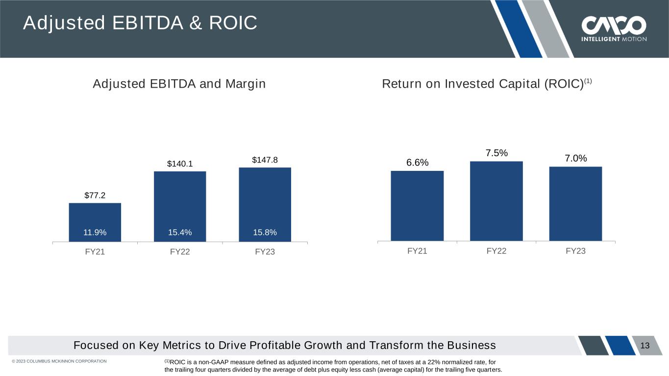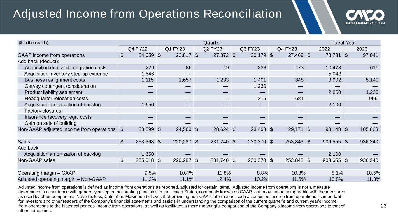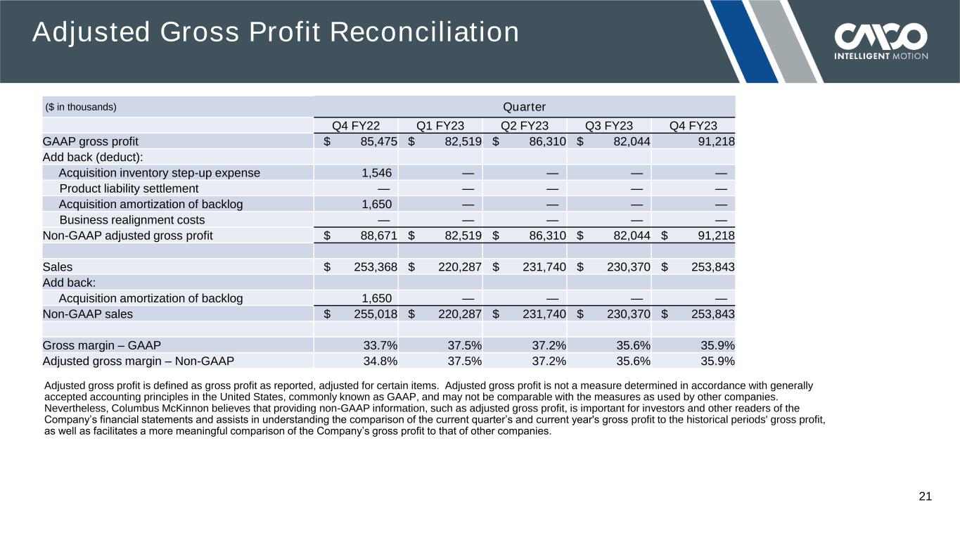 © 2023 COLUMBUS MCKINNON CORPORATION 22 Adjusted Gross Profit Reconciliation Adjusted gross profit is defined as gross profit as reported, adjusted for certain items. Adjusted gross profit is not a measure determined in accordance with generally accepted accounting principles in the United States, commonly known as GAAP, and may not be comparable with the measures as used by other companies. Nevertheless, Columbus McKinnon believes that providing non-GAAP information, such as adjusted gross profit, is important for investors and other readers of the Company’s financial statements and assists in understanding the comparison of the current quarter’s and current year's gross profit to the historical periods' gross profit, as well as facilitates a more meaningful comparison of the Company’s gross profit to that of other companies. ($ in thousands) Fiscal Year 2019 2020 2021 2022 2023 GAAP gross profit $ 304,997 $ 283,186 $ 220,225 $ 315,730 $ 342,009 Add back (deduct): Product liability settlement — — — 2,850 — Acquisition amortization of backlog — — — 2,100 — Acquisition inventory step-up expense — — — 5,042 — Business realignment costs 286 1,037 830 1,606 — Acquisition deal and integration costs — — — 521 — Factory closures 1,473 2,800 2,671 — — Insurance settlement — (382) — — — Gain on sale of building — — (2,189) — — Non-GAAP adjusted gross profit $ 306,756 $ 286,641 $ 221,537 $ 327,849 $ 342,099 Sales $ 876,282 $ 809,162 $ 649,642 $ 906,555 $ 936,240 Add back: Acquisition amortization of backlog — — — 2,100 — Non-GAAP sales $ 876,282 $ 809,162 $ 649,642 $ 908,655 $ 936,240 Gross margin – GAAP 34.8% 35.0% 33.9% 34.8% 36.5% Adjusted gross margin – Non-GAAP 35.0% 35.4% 34.1% 36.1% 36.5%