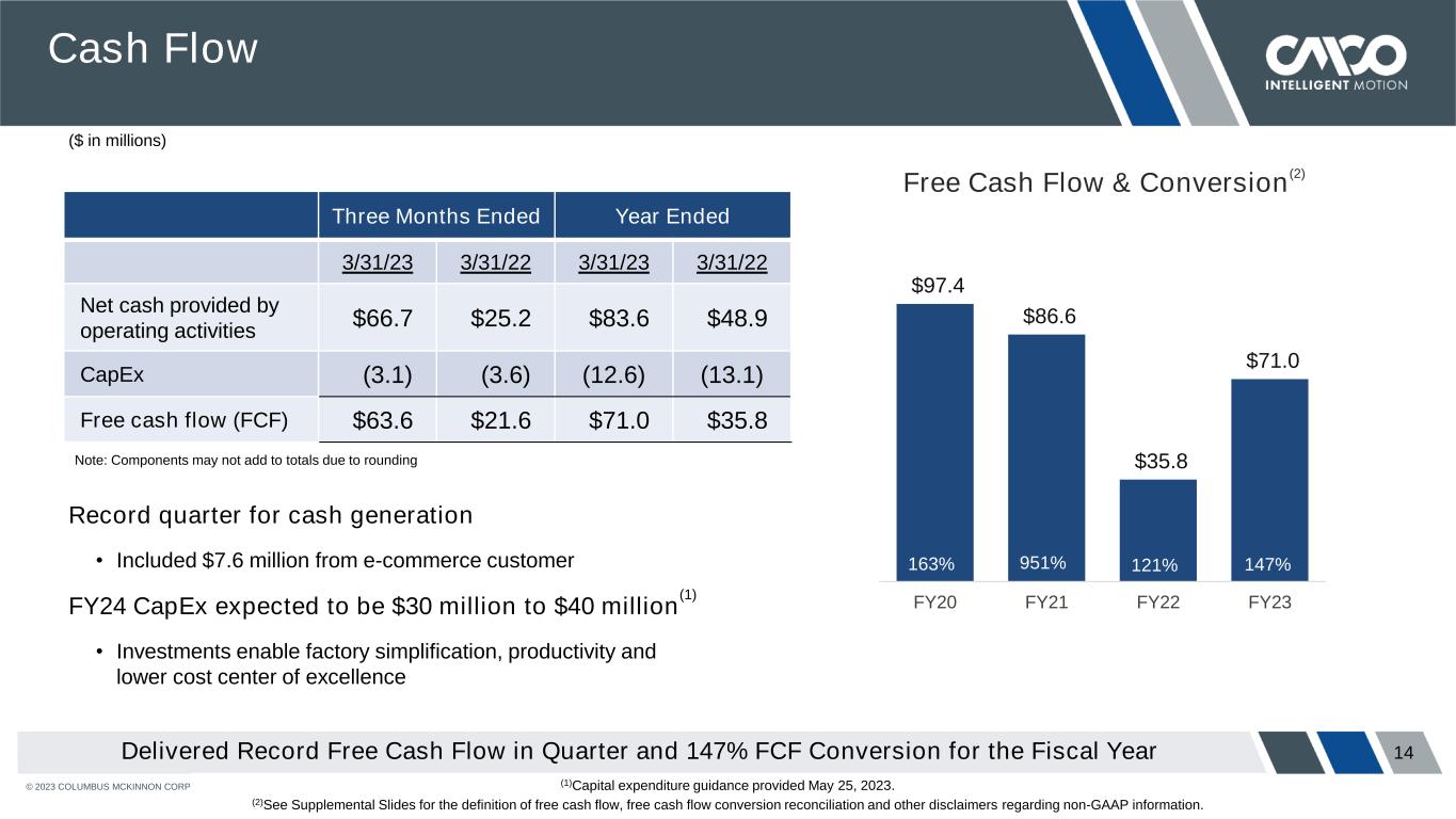 © 2023 COLUMBUS MCKINNON CORPORATION $0.41 $0.29 $0.49 $0.42 $0.48 Q4 FY22 Q1 FY23 Q2 FY23 Q3 FY23 Q4 FY23 12 Earnings Per Share Adjusted EPS GAAP Diluted EPS $0.79 $0.69 $0.73 $0.72 $0.80 Q4 FY22 Q1 FY23 Q2 FY23 Q3 FY23 Q4 FY23 Q4 FY23 GAAP net income grew 17% to $13.9 million, up $0.07 per diluted share y/y • Strong operating income and benefit of FX gain more than offset $2.3 million increase in interest expense Adj. net income of $23.1 million in the quarter Add backs (pre-tax): • $6.6 million of amortization of intangibles • $1.5 million of business realignment & HQ move costs • $0.2 million acquisition deal & integration costs Guidance: • FY24 non-GAAP adjusted tax rate: 25%(1) • Q1 FY24 interest expense: ~$9.0 million(1) • Q1 FY24 diluted shares outstanding: ~29.0 million(1) (1)Guidance on tax rate, interest expense, FX and investment losses and number of diluted shares outstanding provided on May 25, 2023 FY23 Adjusted Earnings per Share Grew 4%