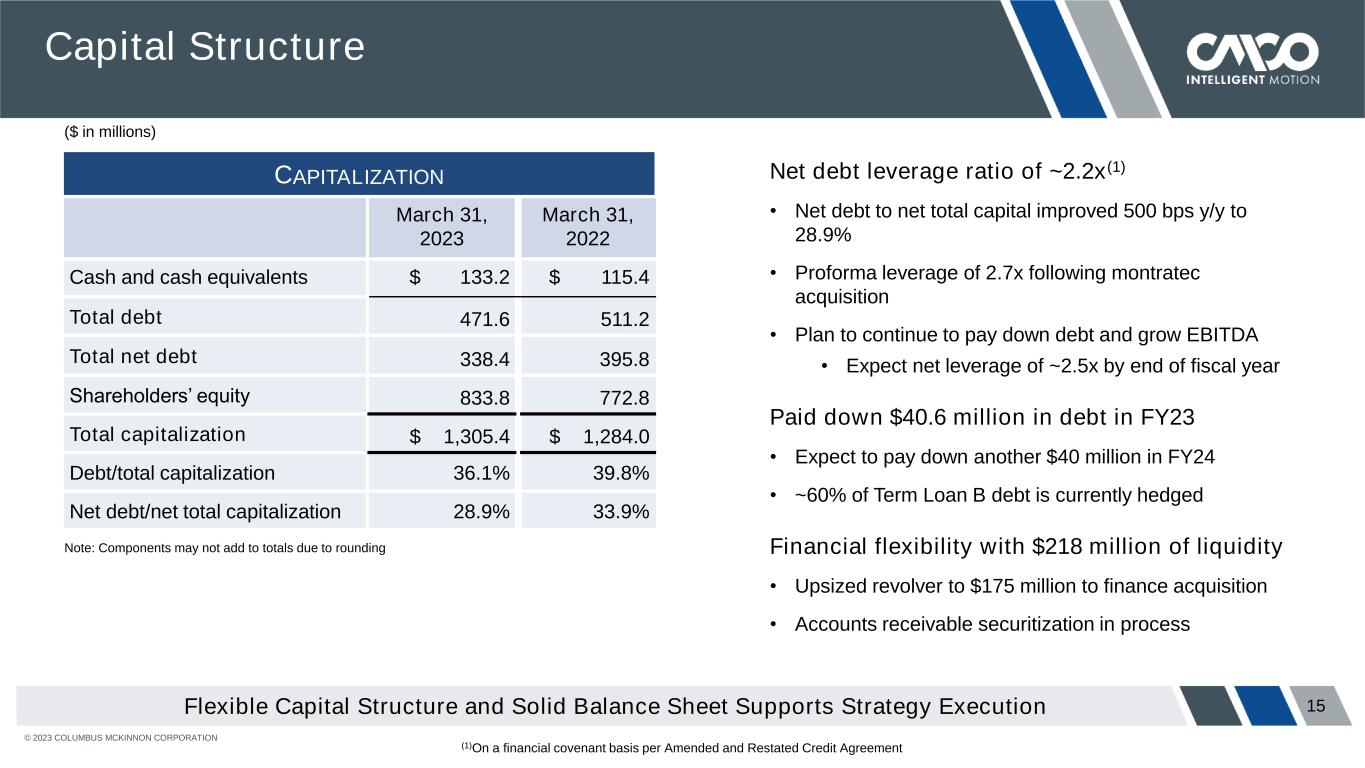 © 2023 COLUMBUS MCKINNON CORPORATION $97.4 $86.6 $35.8 $71.0 163% 951% 121% 147% FY20 FY21 FY22 FY23 14 Free Cash Flow & Conversion (2) Cash Flow Note: Components may not add to totals due to rounding Three Months Ended Year Ended 3/31/23 3/31/22 3/31/23 3/31/22 Net cash provided by operating activities $66.7 $25.2 $83.6 $48.9 CapEx (3.1) (3.6) (12.6) (13.1) Free cash flow (FCF) $63.6 $21.6 $71.0 $35.8 (1)Capital expenditure guidance provided May 25, 2023. (2)See Supplemental Slides for the definition of free cash flow, free cash flow conversion reconciliation and other disclaimers regarding non-GAAP information. Record quarter for cash generation • Included $7.6 million from e-commerce customer FY24 CapEx expected to be $30 million to $40 million (1) • Investments enable factory simplification, productivity and lower cost center of excellence Delivered Record Free Cash Flow in Quarter and 147% FCF Conversion for the Fiscal Year ($ in millions)