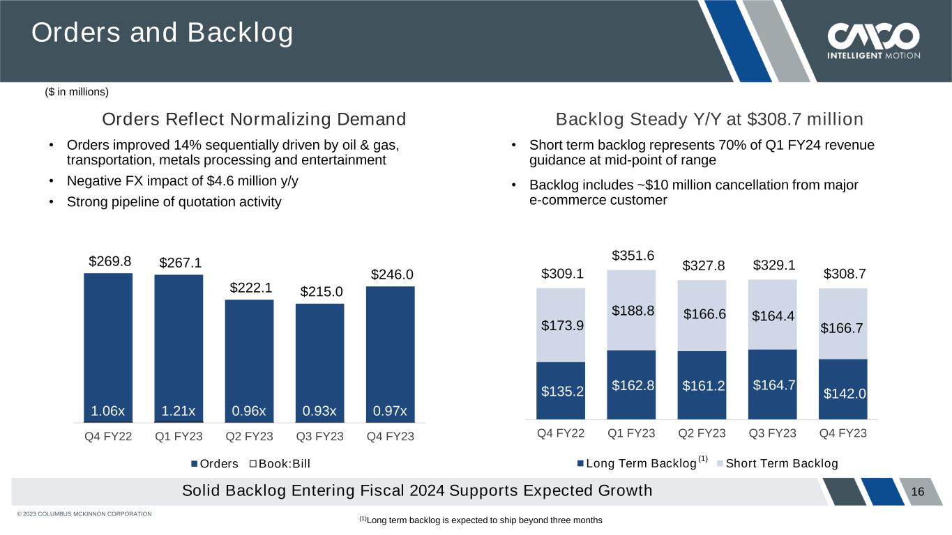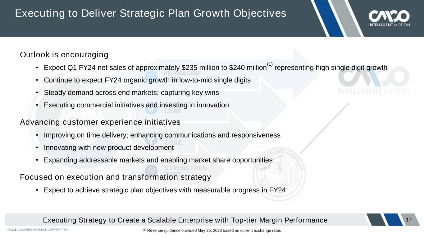 © 2023 COLUMBUS MCKINNON CORPORATION 16 Orders Reflect Normalizing Demand Backlog Steady Y/Y at $308.7 million Orders and Backlog • Orders improved 14% sequentially driven by oil & gas, transportation, metals processing and entertainment • Negative FX impact of $4.6 million y/y • Strong pipeline of quotation activity • Short term backlog represents 70% of Q1 FY24 revenue guidance at mid-point of range • Backlog includes ~$10 million cancellation from major e-commerce customer Solid Backlog Entering Fiscal 2024 Supports Expected Growth $269.8 $267.1 $222.1 $215.0 $246.0 1.06x 1.21x 0.96x 0.93x 0.97x Q4 FY22 Q1 FY23 Q2 FY23 Q3 FY23 Q4 FY23 Orders Book:Bill (1)Long term backlog is expected to ship beyond three months $135.2 $162.8 $161.2 $164.7 $142.0 $173.9 $188.8 $166.6 $164.4 $166.7 $309.1 $351.6 $327.8 $329.1 $308.7 Q4 FY22 Q1 FY23 Q2 FY23 Q3 FY23 Q4 FY23 Long Term Backlog Short Term Backlog (1) ($ in millions)