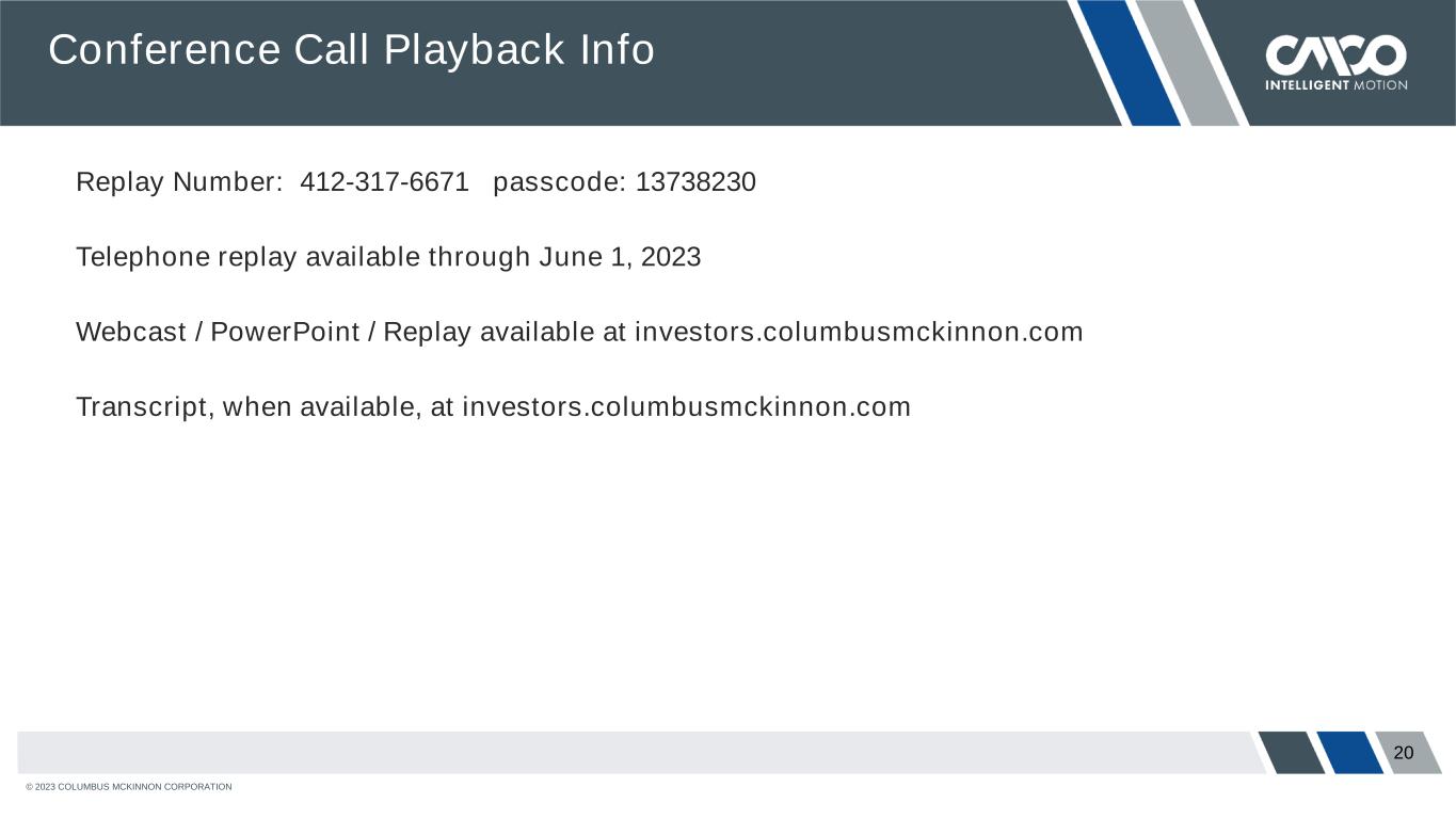 © 2023 COLUMBUS MCKINNON CORPORATION 20 Conference Call Playback Info Replay Number: 412-317-6671 passcode: 13738230 Telephone replay available through June 1, 2023 Webcast / PowerPoint / Replay available at investors.columbusmckinnon.com Transcript, when available, at investors.columbusmckinnon.com