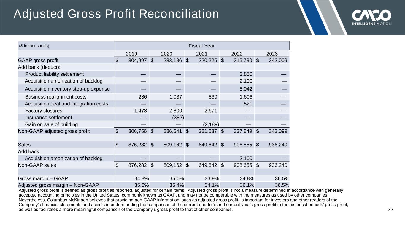 © 2023 COLUMBUS MCKINNON CORPORATION 21 Adjusted Gross Profit Reconciliation Adjusted gross profit is defined as gross profit as reported, adjusted for certain items. Adjusted gross profit is not a measure determined in accordance with generally accepted accounting principles in the United States, commonly known as GAAP, and may not be comparable with the measures as used by other companies. Nevertheless, Columbus McKinnon believes that providing non-GAAP information, such as adjusted gross profit, is important for investors and other readers of the Company’s financial statements and assists in understanding the comparison of the current quarter’s and current year's gross profit to the historical periods' gross profit, as well as facilitates a more meaningful comparison of the Company’s gross profit to that of other companies. ($ in thousands) Quarter Q4 FY22 Q1 FY23 Q2 FY23 Q3 FY23 Q4 FY23 GAAP gross profit $ 85,475 $ 82,519 $ 86,310 $ 82,044 91,218 Add back (deduct): Acquisition inventory step-up expense 1,546 — — — — Product liability settlement — — — — — Acquisition amortization of backlog 1,650 — — — — Business realignment costs — — — — — Non-GAAP adjusted gross profit $ 88,671 $ 82,519 $ 86,310 $ 82,044 $ 91,218 Sales $ 253,368 $ 220,287 $ 231,740 $ 230,370 $ 253,843 Add back: Acquisition amortization of backlog 1,650 — — — — Non-GAAP sales $ 255,018 $ 220,287 $ 231,740 $ 230,370 $ 253,843 Gross margin – GAAP 33.7% 37.5% 37.2% 35.6% 35.9% Adjusted gross margin – Non-GAAP 34.8% 37.5% 37.2% 35.6% 35.9%